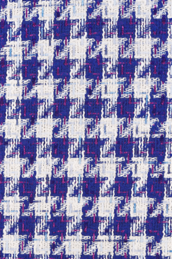 Italská kostýmní látka chanel ve světle tmavě modré a krémové barvě, zdobená třpytivou nití ve fuchsiové/růžové. Látka je měkká, příjemná na dotek, vyrobená převážně z přírodních vláken, proto je velmi příjemná na nošení, známá svou originální vazbou. Je ideální pro šití kostýmu, šatů a tenkého kabátu.
