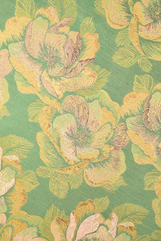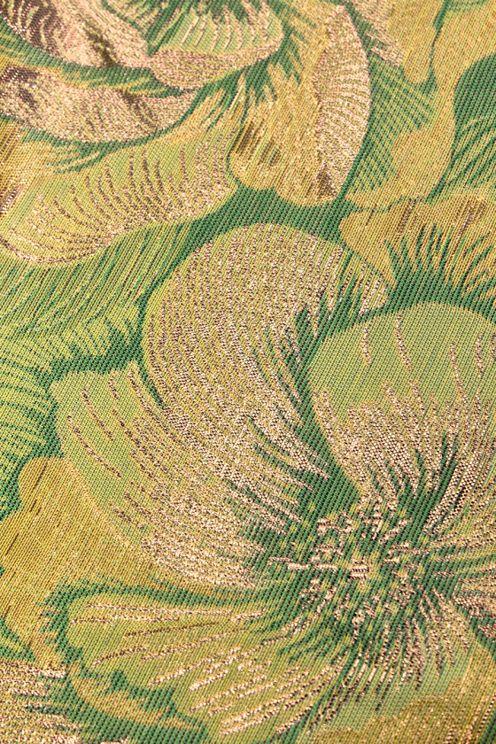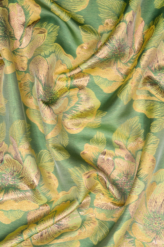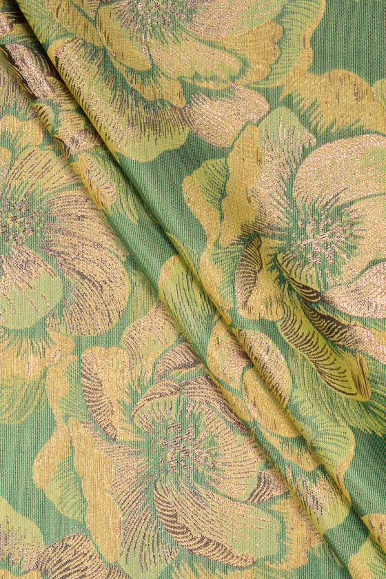Italská žakárová kostýmová látka v zelené barvě s motivem velkých žlutých a zelených květů zakončená měděnou nití. Látka je mírně duhová, tenká a měkká, ale neprůhledná. Hustě uspořádané květy o rozměrech 22 cm * 22 cm. Ideální nabídka pro šití fenomenálních šatů, sukně, lehkého kabátu.
