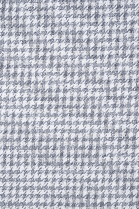 Italská bavlněná látka se lnem a polyesterem s motivem malé kuřecí nohy ve světle šedé a krémové barvě. Tkanina je masitá, nepružná, s mírně volnou vazbou, ale zcela neprůhledná. Klasický návrh pro kalhoty, saka, šaty, sukně a šortky.