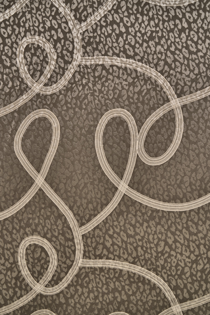 Italská polyesterová tkanina s motivem stuhy a leopardího potisku na tmavě béžovém pozadí. Žakárový leopardí vzor vyrobený ze saténové vazby. Světle béžové stuhy jsou široké 13 mm. Látka je lehká, vzdušná, elastická, tenká, ale neprůhledná. Velmi zajímavá nabídka, která bude vypadat krásně v šitých šatech, sukni, ale i halence nebo košili.