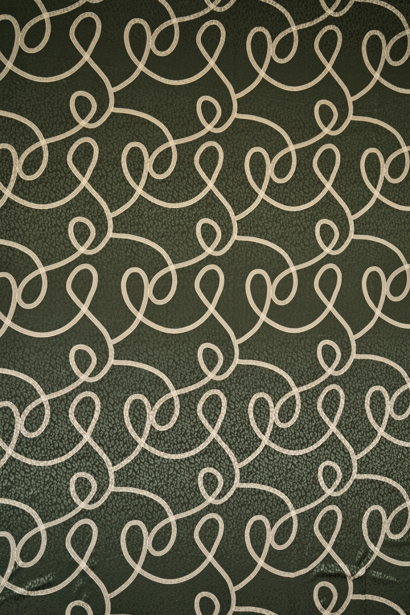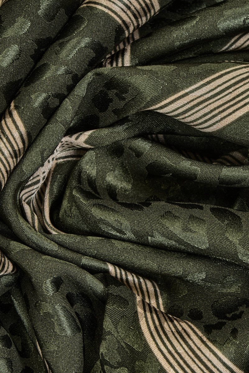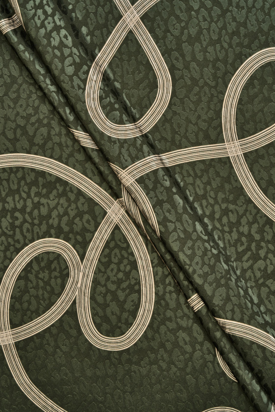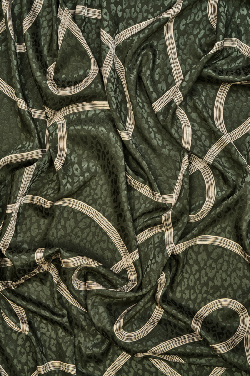 Italská polyesterová tkanina s mašlí a motivem leopardího potisku na zeleném pozadí lahve. Žakárový leopardí vzor vyrobený ze saténové vazby. Světle béžové stuhy jsou široké 13 mm. Látka je lehká, vzdušná, elastická, tenká, ale neprůhledná. Velmi zajímavá nabídka, která bude vypadat krásně v šitých šatech, sukni, ale i halence nebo košili.