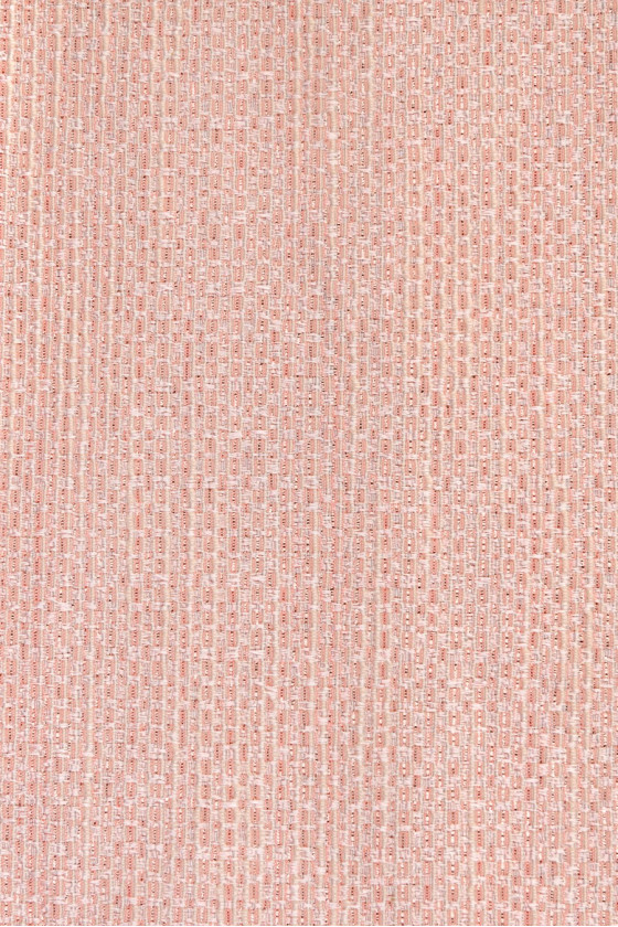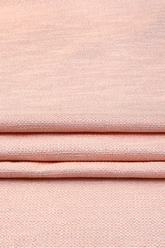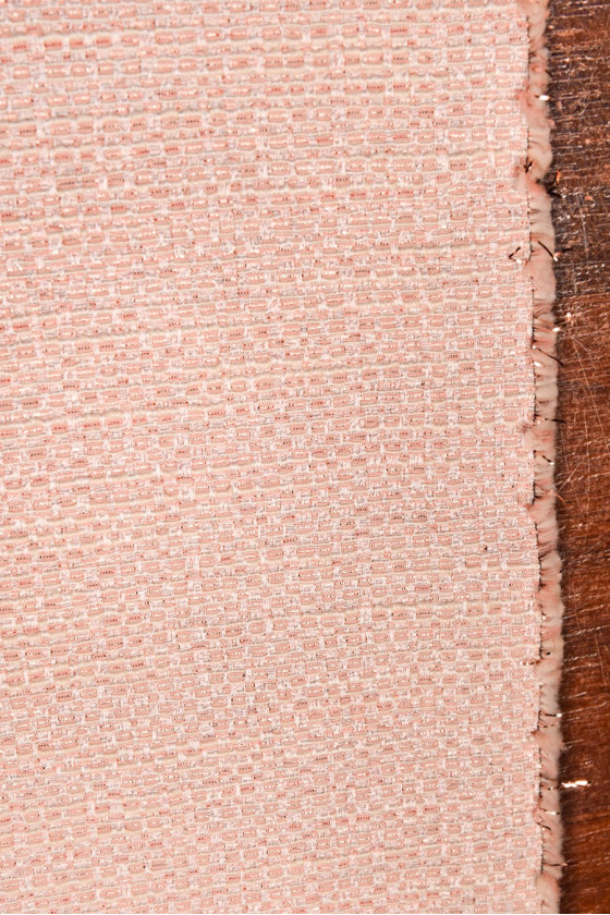 Italská žakárová kostýmová látka v lososové barvě. Materiál s čirou vazbou, která mu dodává strukturu, celek zdobí lesklá nit v barvě růžového zlata. Látka má velmi jemný vzor, který je účinnější jemným leskem. Skvěle se hodí k ušití klasických krojů, šatů, sukně nebo jako dekorační látka.
