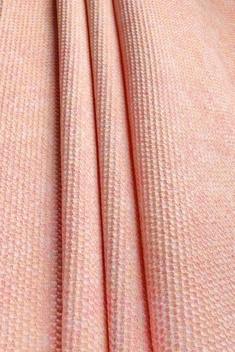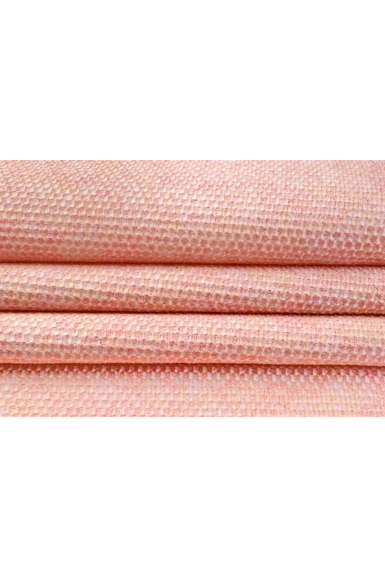 Italská žakárová kostýmová látka v lososově žluté barvě. Tkanina s jemným, reliéfním geometrickým vzorem, který připomíná včelí pláství. Celek je zdoben lesklou zlatou nití, která mu dodává eleganci a noblesu. Velmi subtilní návrh pro šití kabátu, kostýmu nebo jako dekorační látka.