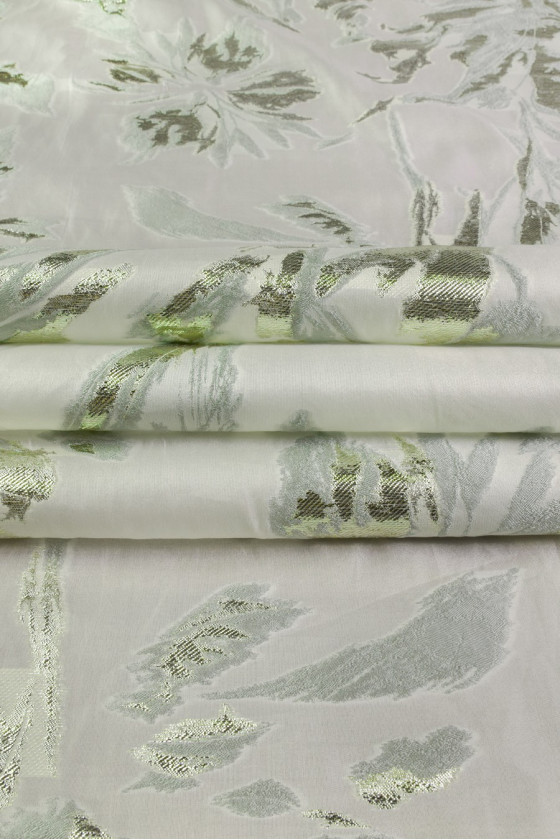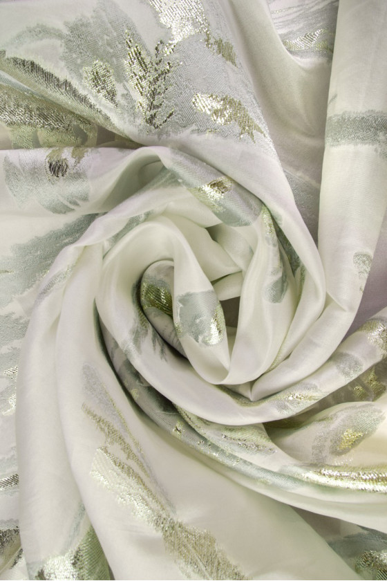 Exkluzivní krémový žakár s velkým šedým vzorem s kapkou zelené a přídavkem zlaté lurexové nitě. Tkanina strukturou připomíná taft. Krásná nabídka na šaty, sukni, bundu, tenký kabát.