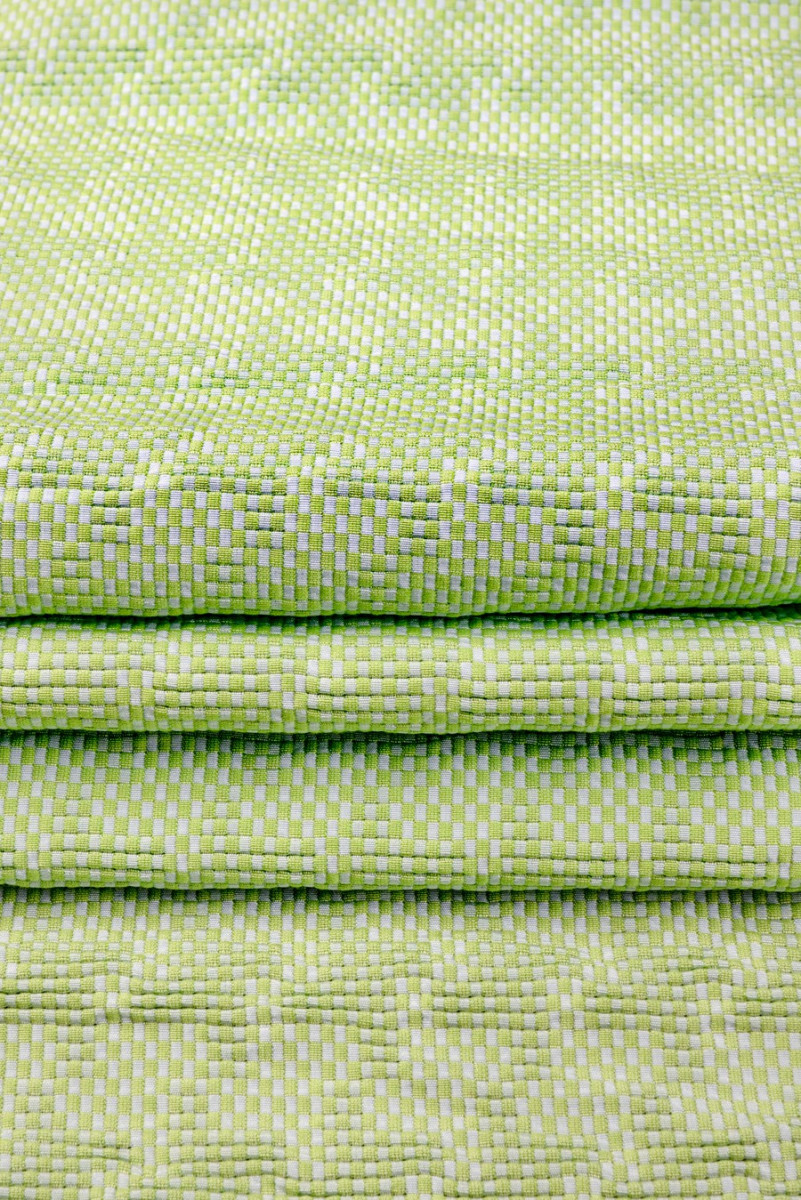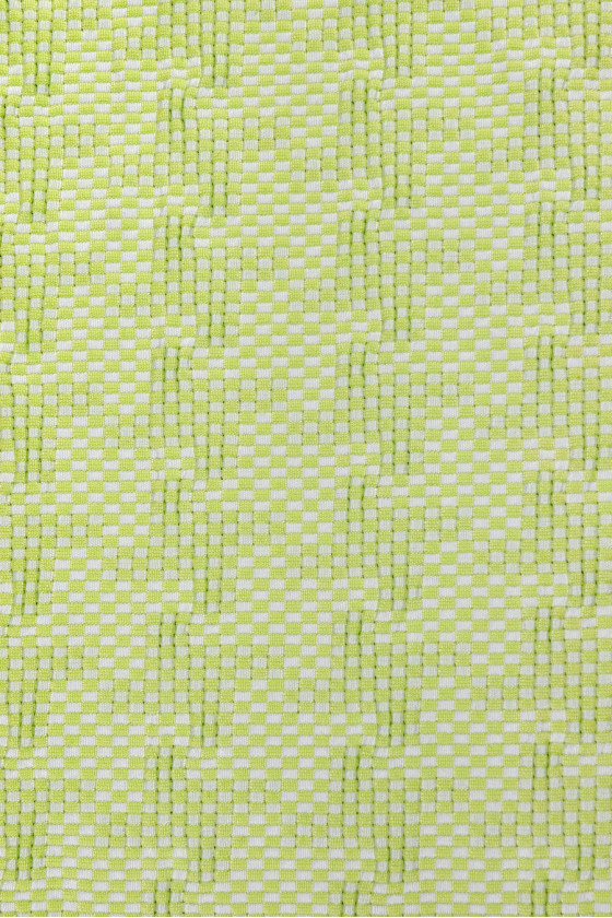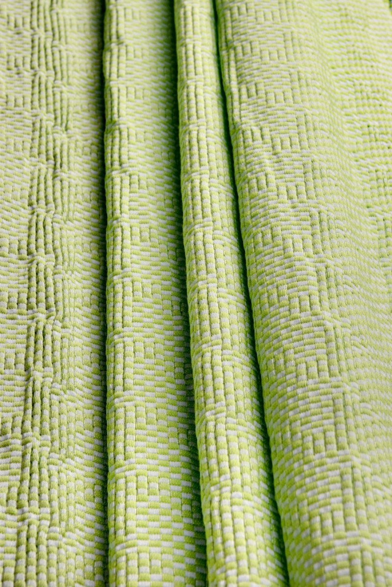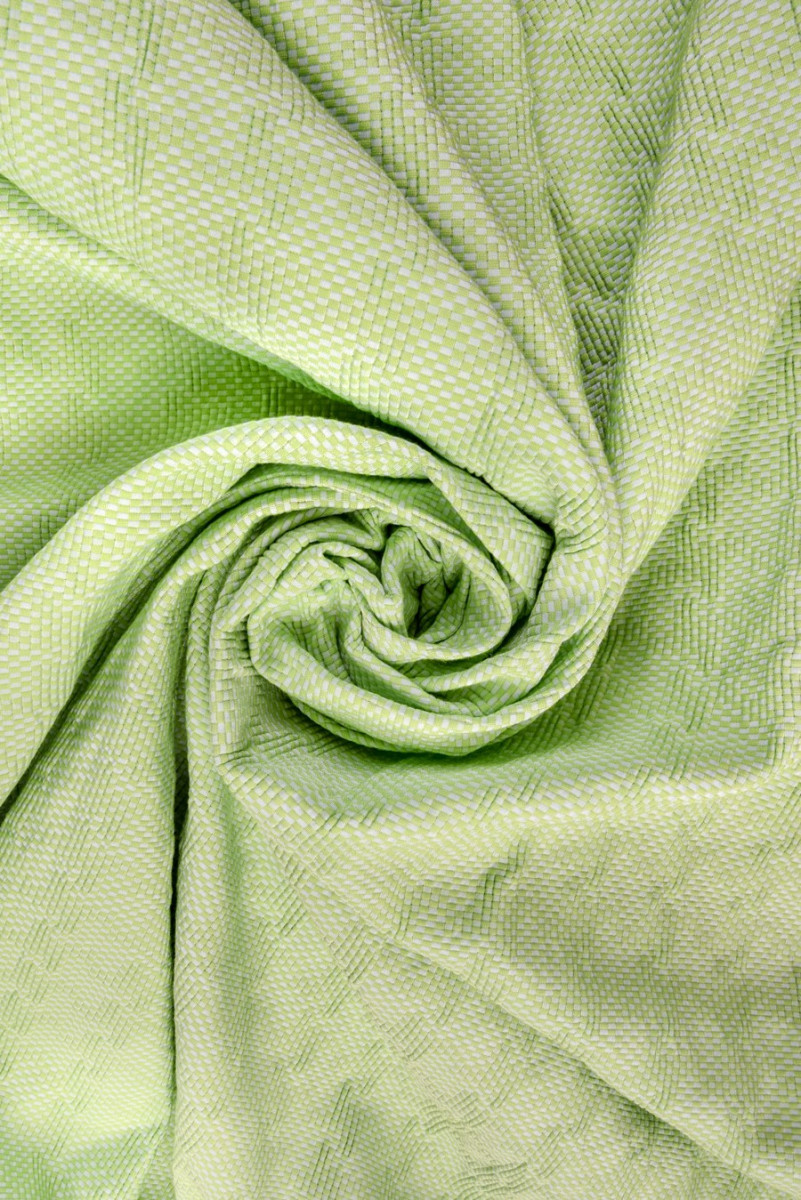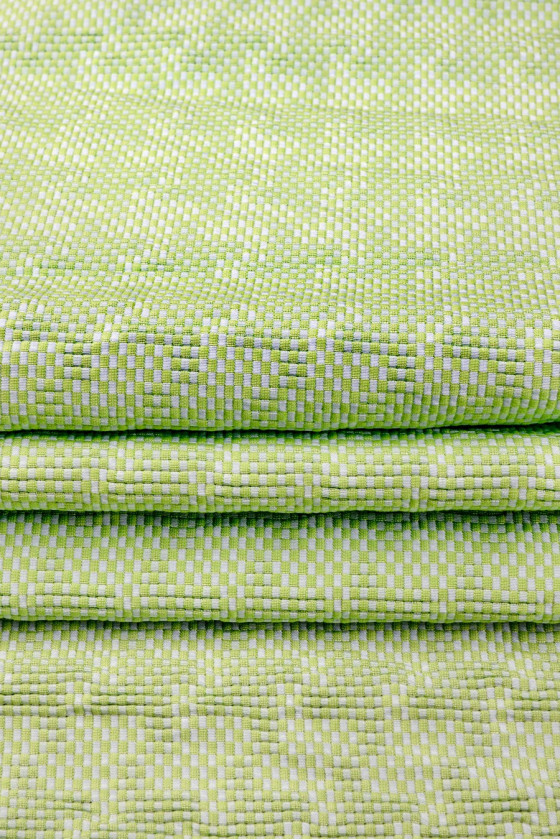 Italská žakárová kostýmová látka s motivem kuřecí nohy o velikosti cca 2 cm. Látka je dodávána v krémově zelených barvách a má velmi čirou, hustou vazbu, která jí dodává strukturu. Tkanina je silnější, tuhá, neelastická. Má širokou škálu aplikací, včetně. k ušití kostýmu, kabátu, ale i jako dekorace.