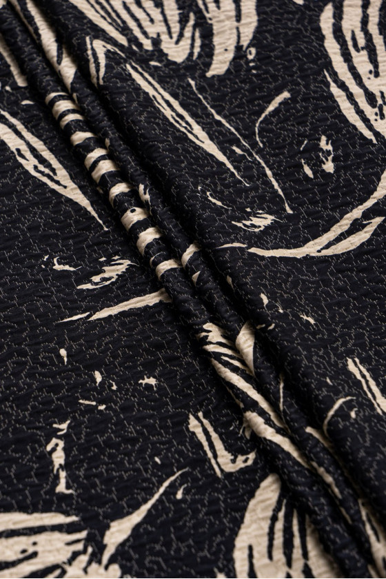 Italská kostýmová látka v černé barvě s velkým motivem exotických listů v béžové barvě. Látka je tenká, příjemná na dotek s jasně konvexní, mírně pomačkanou (zmačkanou) strukturou. Skvěle se hodí k ušití zajímavých šatů, sukně nebo jako dekorační látka.