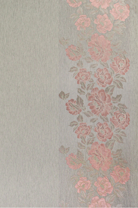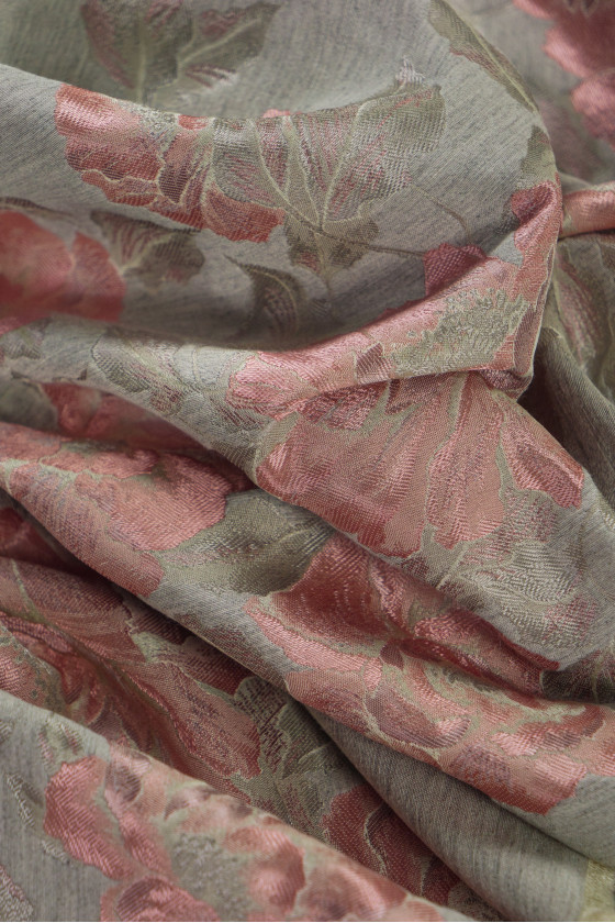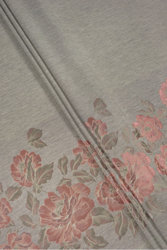 Italská žakárová kostýmní látka v šedé melíru s motivem růžových květů. Látka je dodávána v kupónu o rozměrech 110 cm* 153 cm. Horní část kupónu je hladká, ve spodní části máme krásný květinový motiv široký 40 cm.
