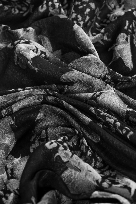 Italská žakárová látka v černé barvě s motivem šedých květů - směs přírodního hedvábí a polyesteru. Tenká, mírně průhledná, měkká, neelastická tkanina s jemným leskem charakteristickým pro hedvábné tkaniny - lze ji šít oboustranně.