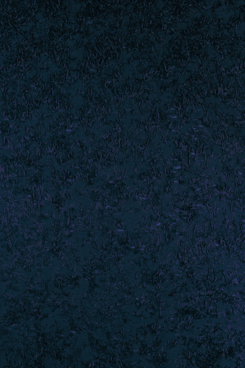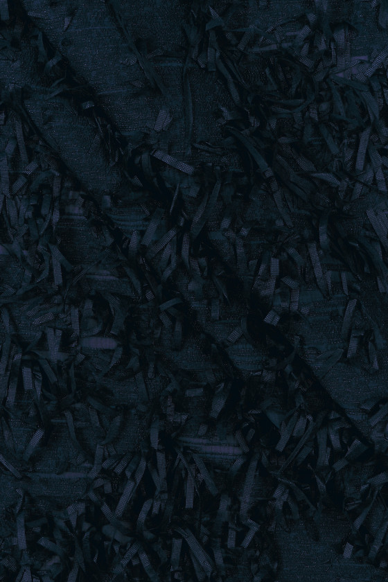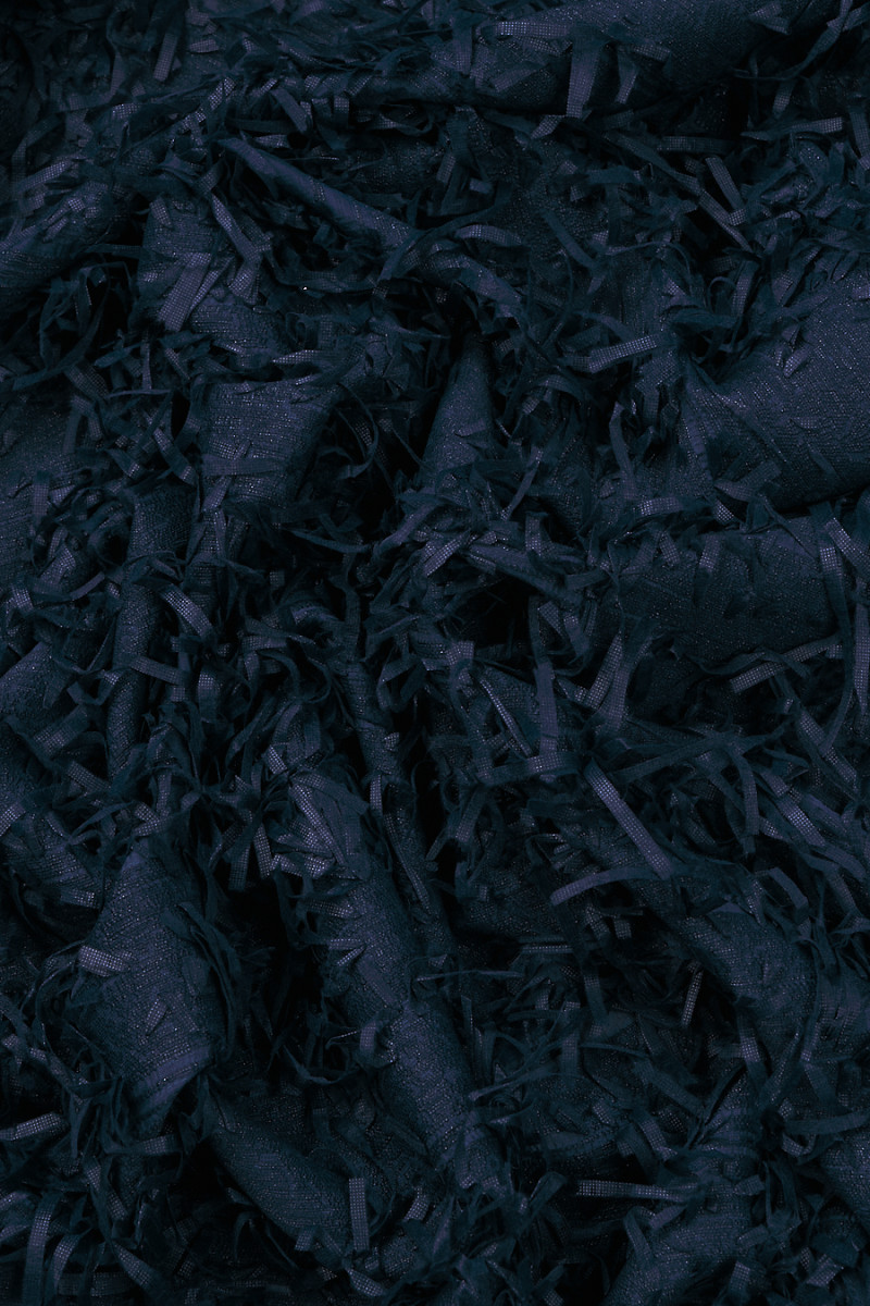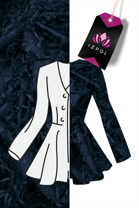 Italská žakárová kostýmová látka v tmavě modré barvě, nepravidelně zdobená 8 cm dlouhými třásněmi. Středně silná tkanina, neelastická, mírně tuhá. Ideální pro šití kostýmu, šatů, sukně, saka nebo pro dekorativní účely.