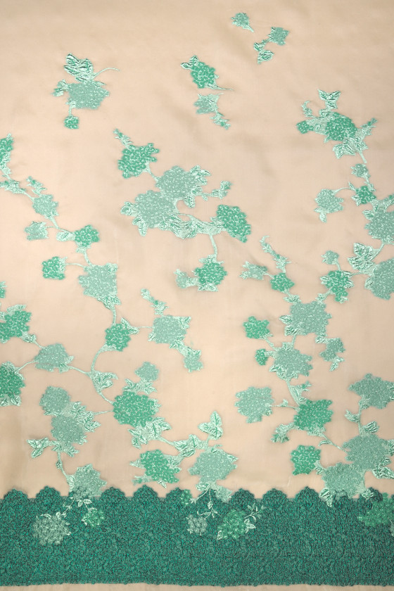 Italská organzová tkanina v kupónu o rozměru 200 cm* 140 cm, zdobená lurexovou nití. Mátová látka s žakárovým motivem květů buz v zelené barvě, vzor směrem ke spodní části kupónu zesiluje, který je zakončen 25 cm širokým pruhem v barvě lahvově zelené.