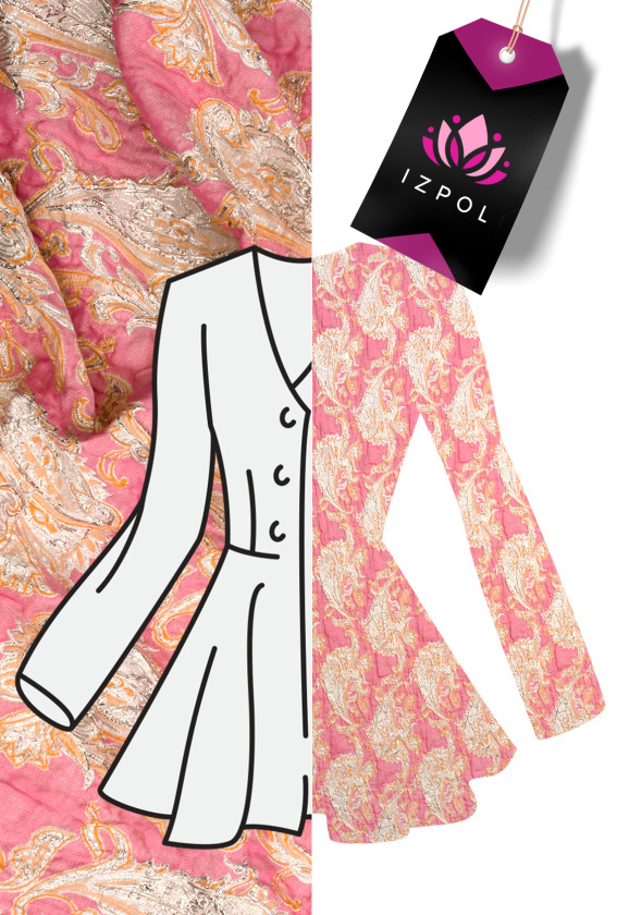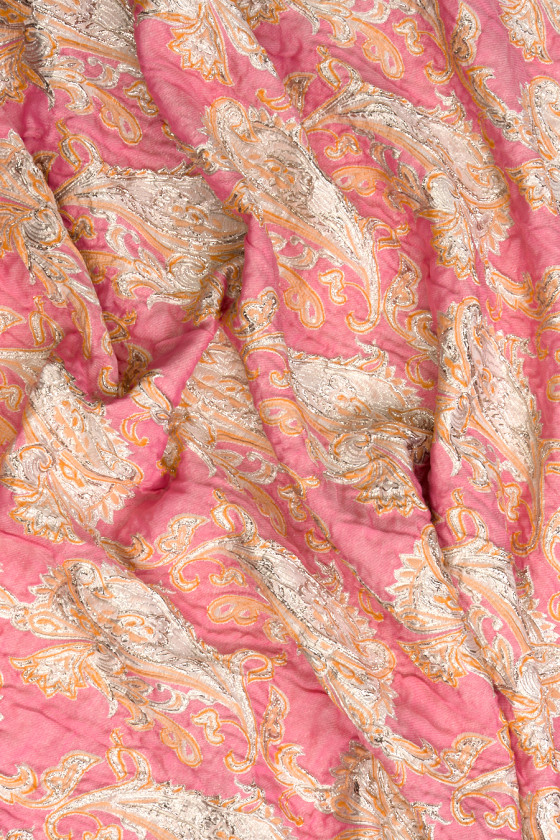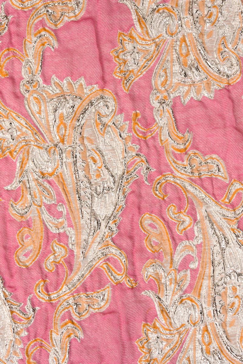 Italská žakárová kostýmová látka v růžové barvě s hustým motivem orientálních vzorů kašmírového vzoru z platiny s oranžovým okrajem. Tkanina je mírně tuhá a má zvrásněnou, konvexní strukturu. Velmi cool, jarní nabídka pro ušití elegantních šatů, sukně nebo kostýmu.