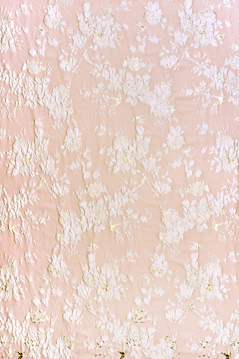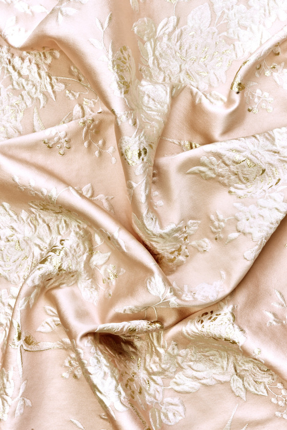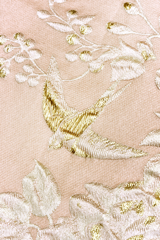 Italská žakárová látka v lososově růžové barvě s květinovým motivem v krémové barvě. Hustý vzor růžových květů v různých velikostech a malých vlaštovek, vše částečně zdobené zlatou nití. Tkanina je masitá, nepružná, neprůhledná a mírně tuhá. Krásná nabídka, ze které můžete vytvořit jedinečnou sukni, šaty, lehký kabát nebo ji dokonce použít k dekorativním účelům.
