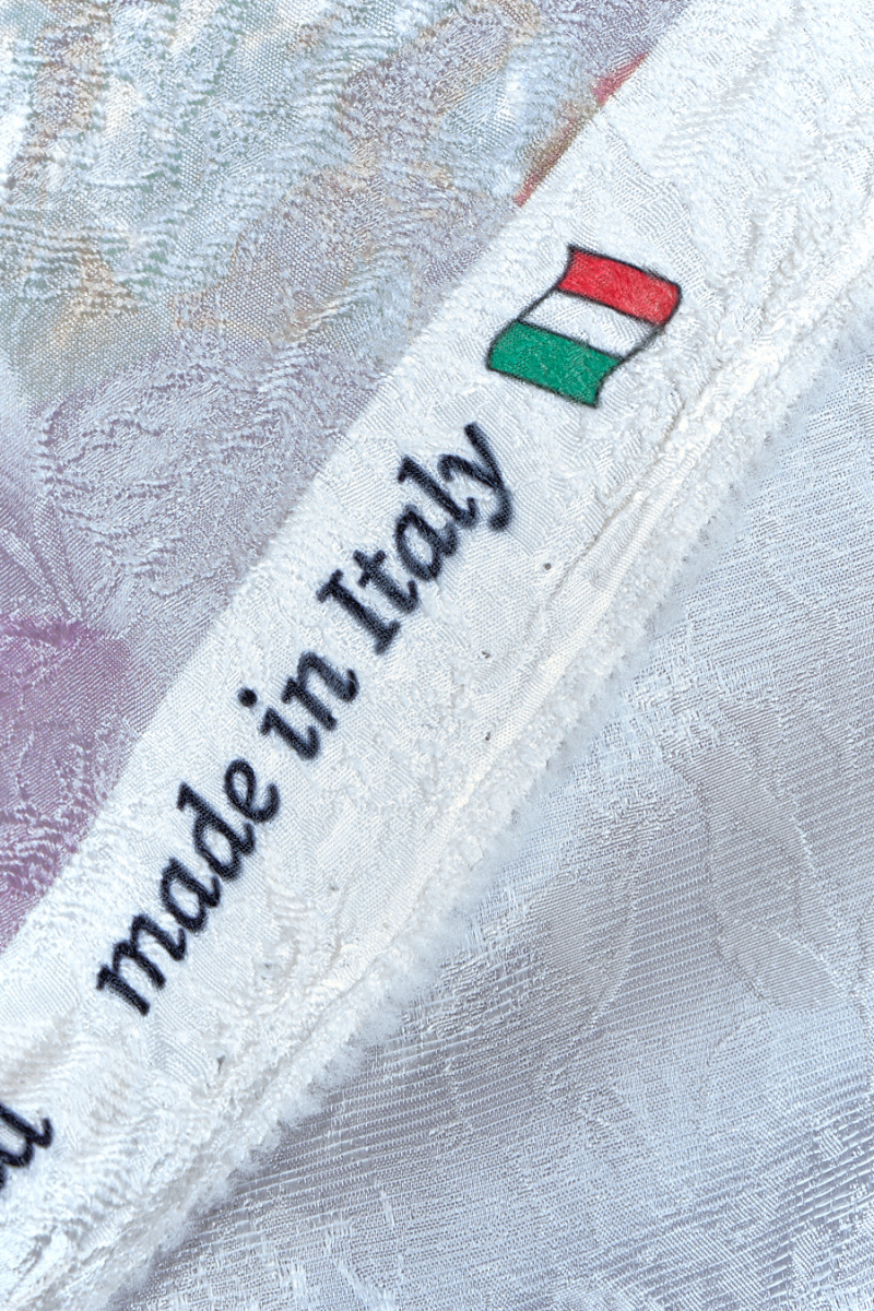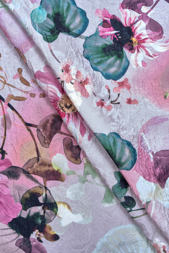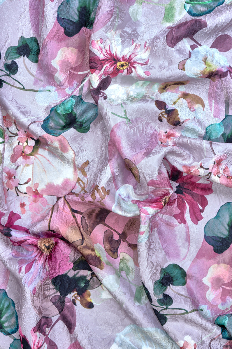 Italská žakárová látka s krásným květinovým motivem ve světlých a tmavých odstínech růžové na světle růžovém podkladu, celý vzor je obohacen o motivy tmavě zelených listů. Látka má hustý, ale jemný reliéfní květinový vzor. Je masitý, neprůhledný, nepružný a pěkně sedí. Originální návrh, který bude dobře fungovat při šití šatů, sukně, saka a kalhot.