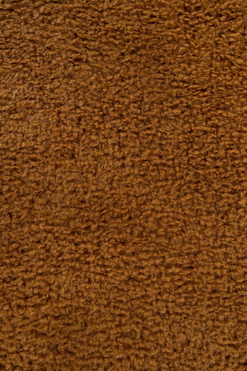 Italská ekokožešinová tkanina ve velbloudí barvě. Látka je velmi jemná s kudrnatými, delšími vlasy připomínajícími mohér.