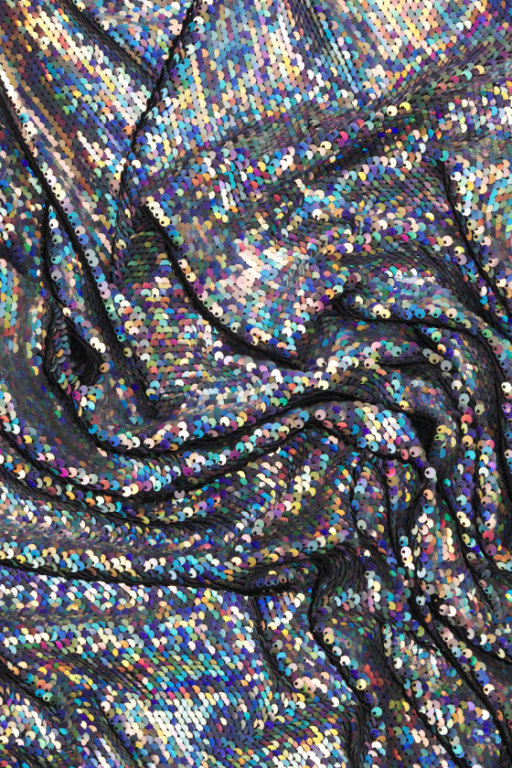 Italská večerní látka - flitry převrácené na jedné straně černé a hologramové flitry na druhé straně, našité na elastické pletenině. Látka je těžká, krásně lesklá, elastická. Ideální pro šití večerních šatů, halenky nebo sukně.