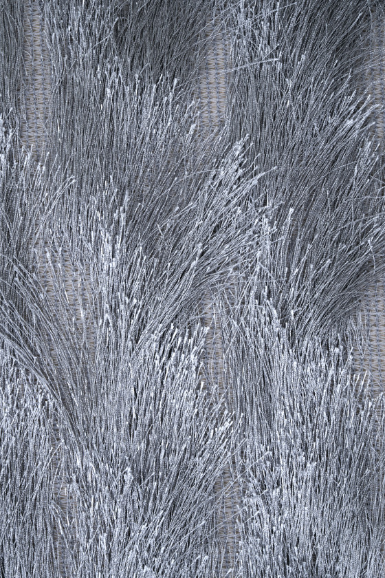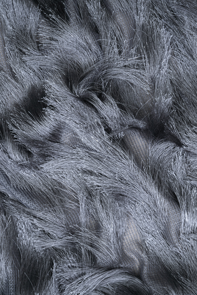 Večerní látka s našitými šedými střapci a průhlednými stuhami. Střapce šité ve tvaru vlny. Látka je mírně průhledná, elastická a měkká.