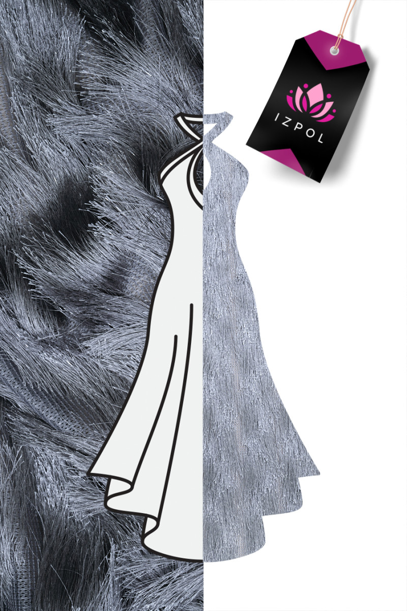 Večerní látka s našitými šedými střapci a průhlednými stuhami. Střapce šité ve tvaru vlny. Síť je široká 140 cm, třásně jsou široké 125 cm. Látka je mírně průhledná, elastická a měkká - krásný návrh pro šití večerních šatů, halenky, sukně.