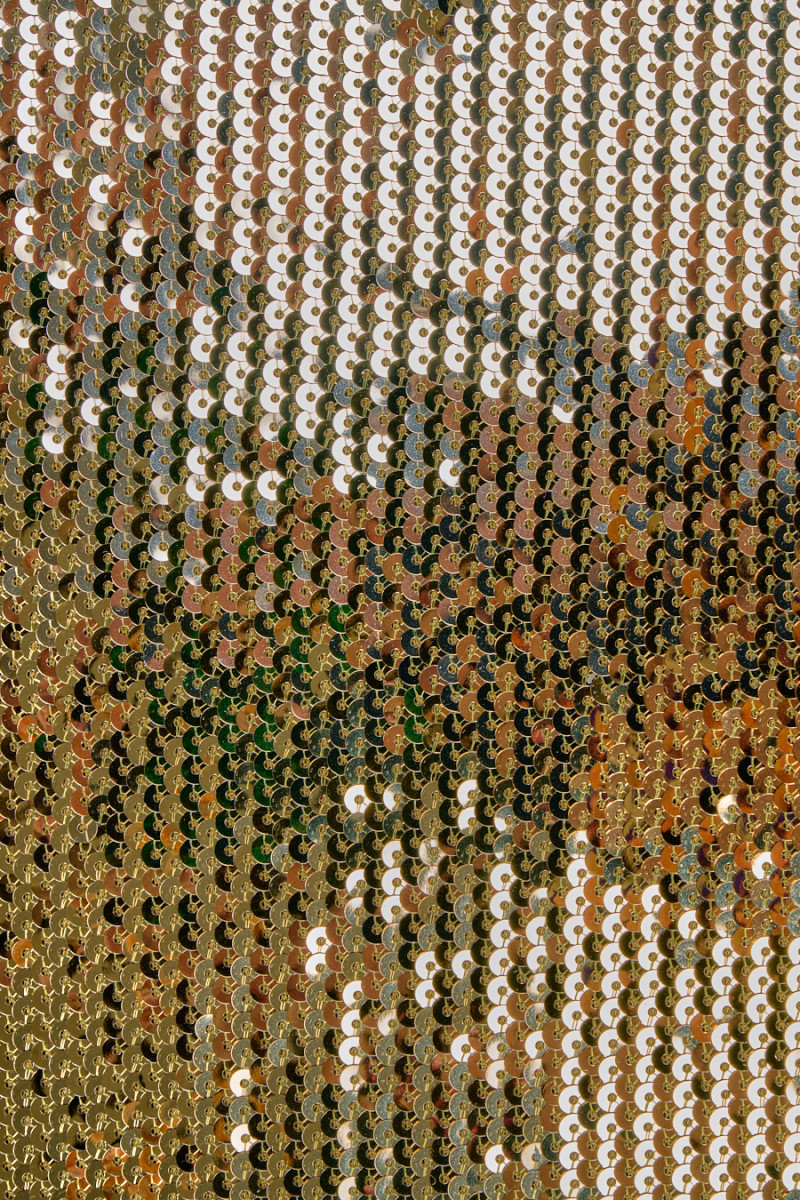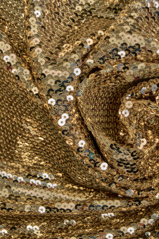 Exkluzivní látka s flitry ve zlaté barvě. Hustě a pravidelně uspořádané v řadách 5 mm flitry, které silně odrážejí světlo a vytvářejí úžasný lesklý efekt. Flitry našité na béžové elastické síťovině o šířce 170 cm, flitry umístěné na šíři 145 cm. Fantastická nabídka pro ušití večerních šatů, sukně nebo halenky v oslnivé edici.