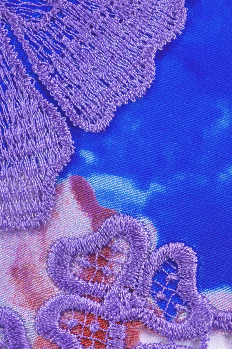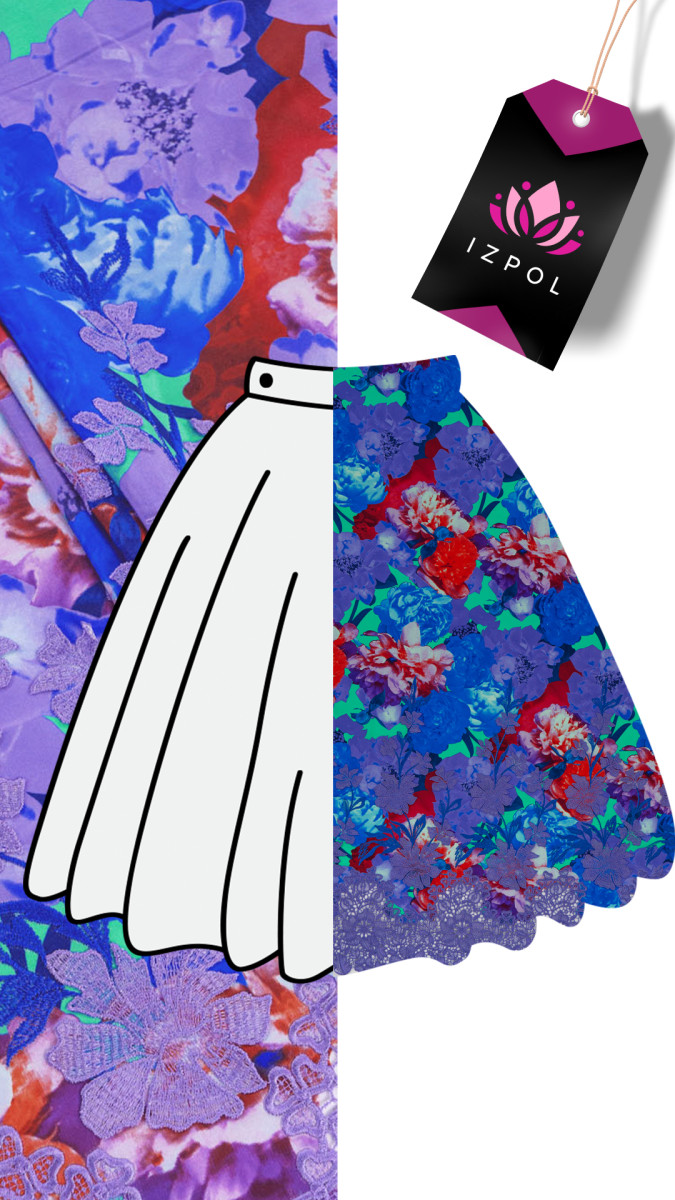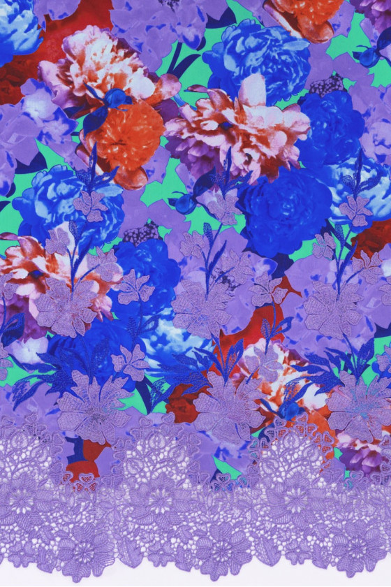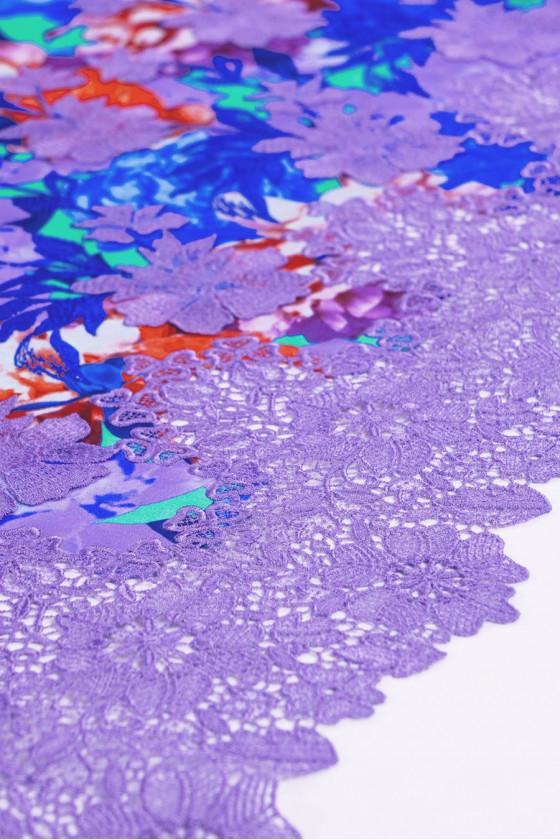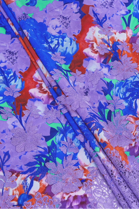 Italská hedvábná látka s barevnými velkými květy s 3D květinovou výšivkou, zakončená fialovým guipure. Látka je šitá po obvodu. Látka je ideální pro šití šatů, halenky, sukně.