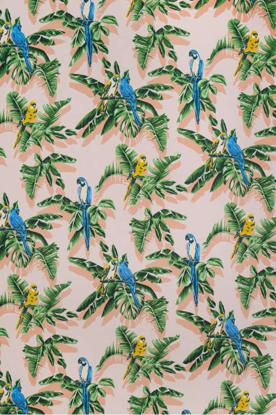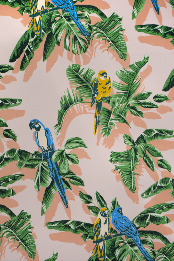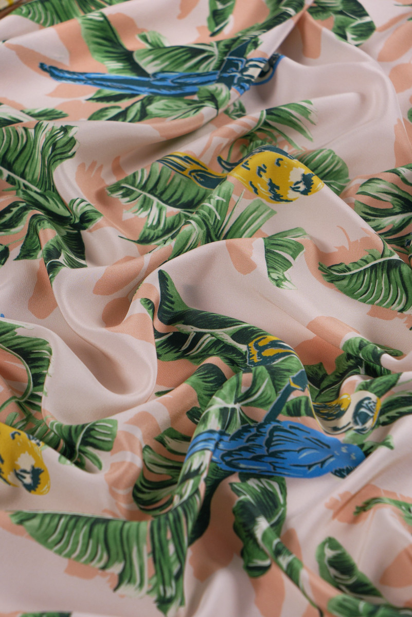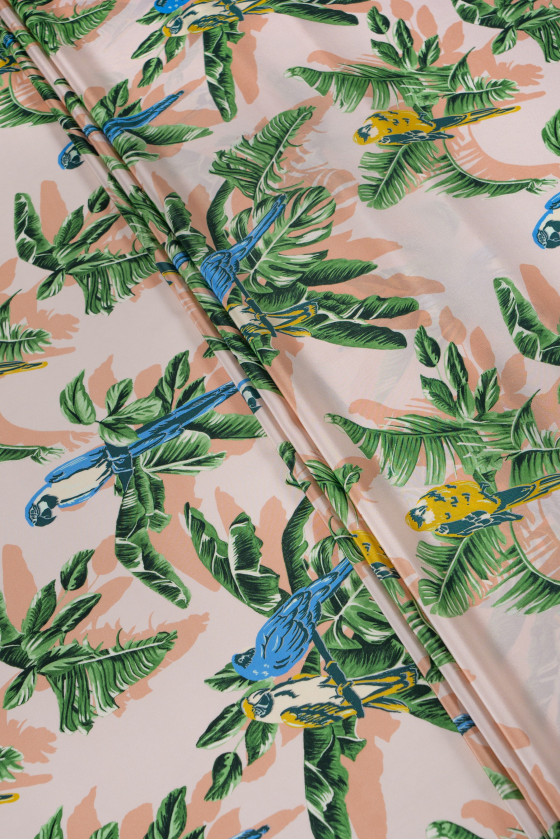 Italský krepový 100% hedvábí ve světle růžové barvě s motivem listů a žlutých a modrých papoušků. Hedvábný krep je jemná, tenká, polomatná tkanina.