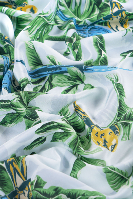 Italský 100% hedvábný krep ve světle šedé barvě s motivem listů a modrých a žlutých papoušků. Hedvábný krep je jemná, tenká, polomatná látka. Lze s ním vykouzlit vzdušné šaty, jemné halenky, šátky, šátky.