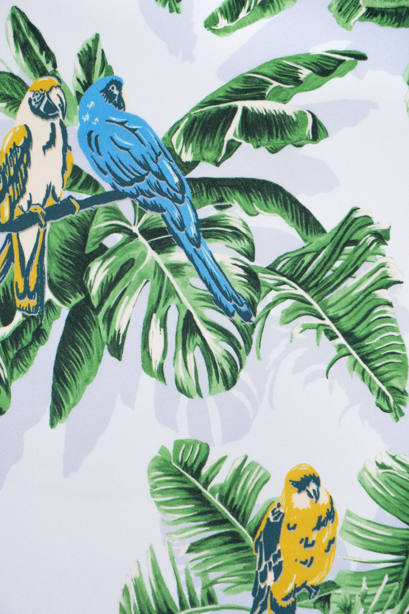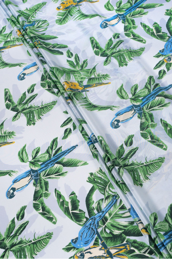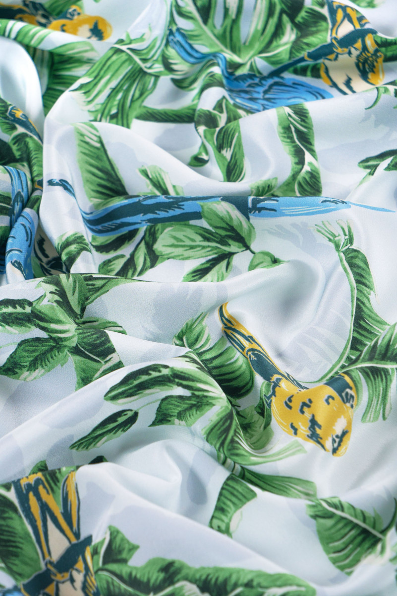 Italský krepový 100% hedvábí ve světle šedé barvě s motivem listů a modrých a žlutých papoušků. Hedvábný krep je jemná, tenká, polomatná tkanina.