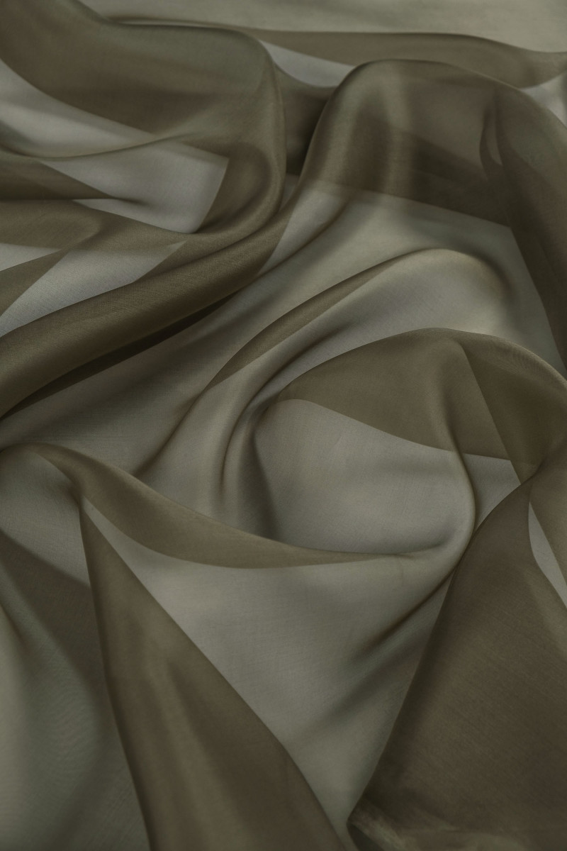 Italská 100% hedvábná organza v khaki barvě. Organza z přírodního hedvábí je tenká, průhledná, ale tuhá tkanina s jemným leskem charakteristickým pro hedvábné tkaniny.
