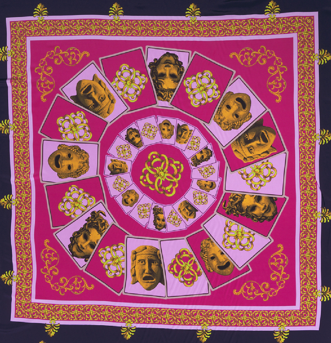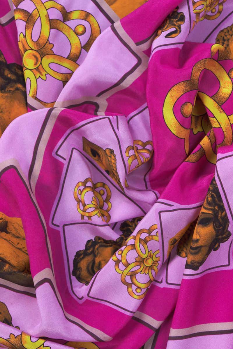 Italské krepové 100% hedvábí v kupónu o rozměrech 145 cm* 140 cm s motivem zlatých ozdob a masek na fialovém a fuchsiovém pozadí.