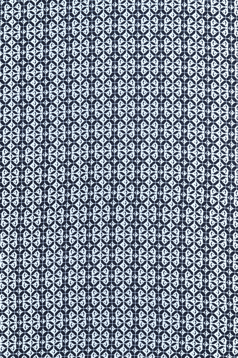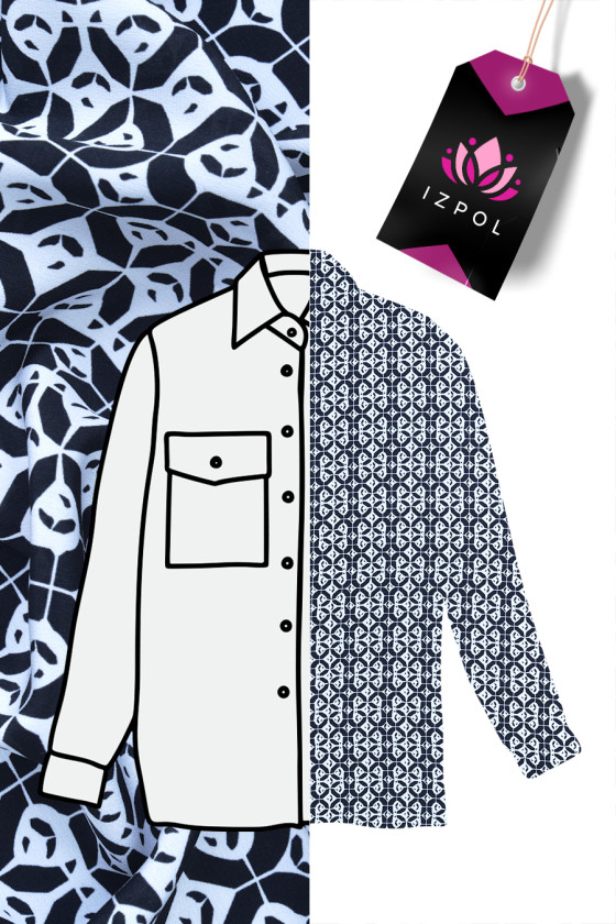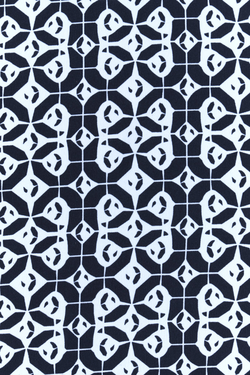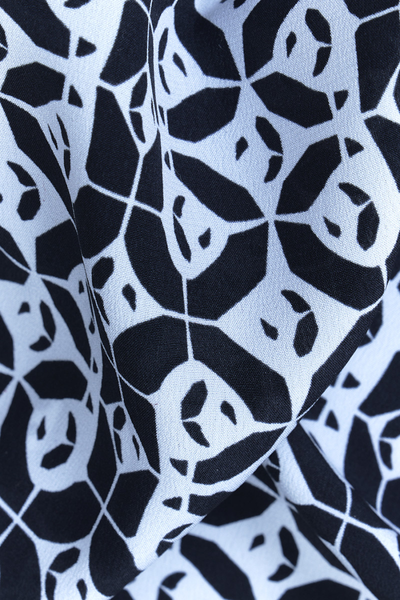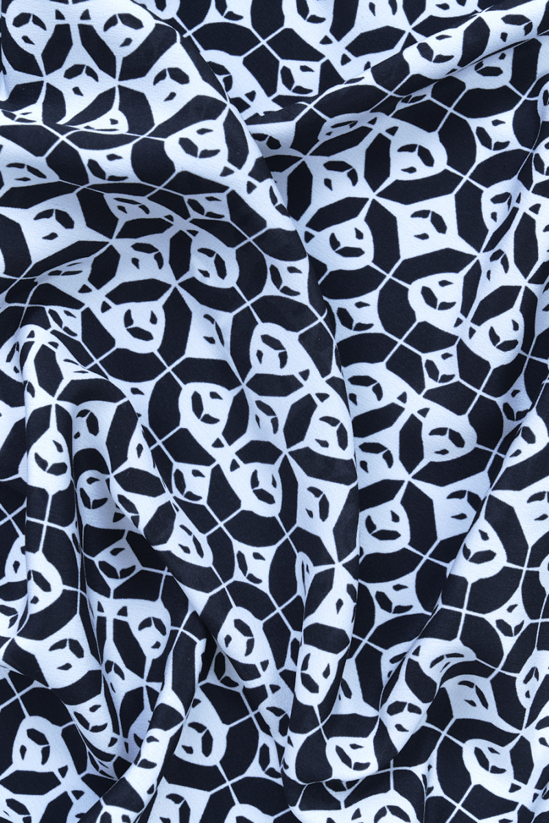 Italský 100% hedvábný krep v černé barvě s motivem malých, geometrických vzorů v krémové barvě. Fantastický návrh na ušití košile nebo šatů pro lidi, kteří mají rádi nadčasové vzory a barvy.