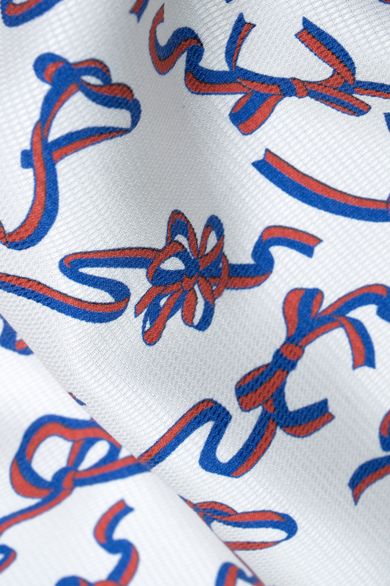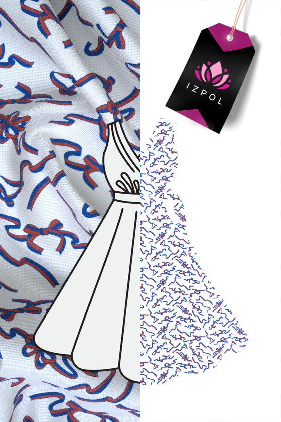 Italská 100% hedvábná látka v krémové barvě s motivem stuhy. Tkanina je o něco silnější, má jemnou žakárovou strukturu a jemný lesk charakteristický pro hedvábné tkaniny. Vzor je hustý s nepravidelným tvarem v modré a červené barvě, je v kolekci známého italského módního domu. Je to fantastický návrh na ušití lehké halenky nebo šatů. Pokud máte rádi ušlechtilé látky a značkové vzory v módních barvách, je to látka právě pro vás.
