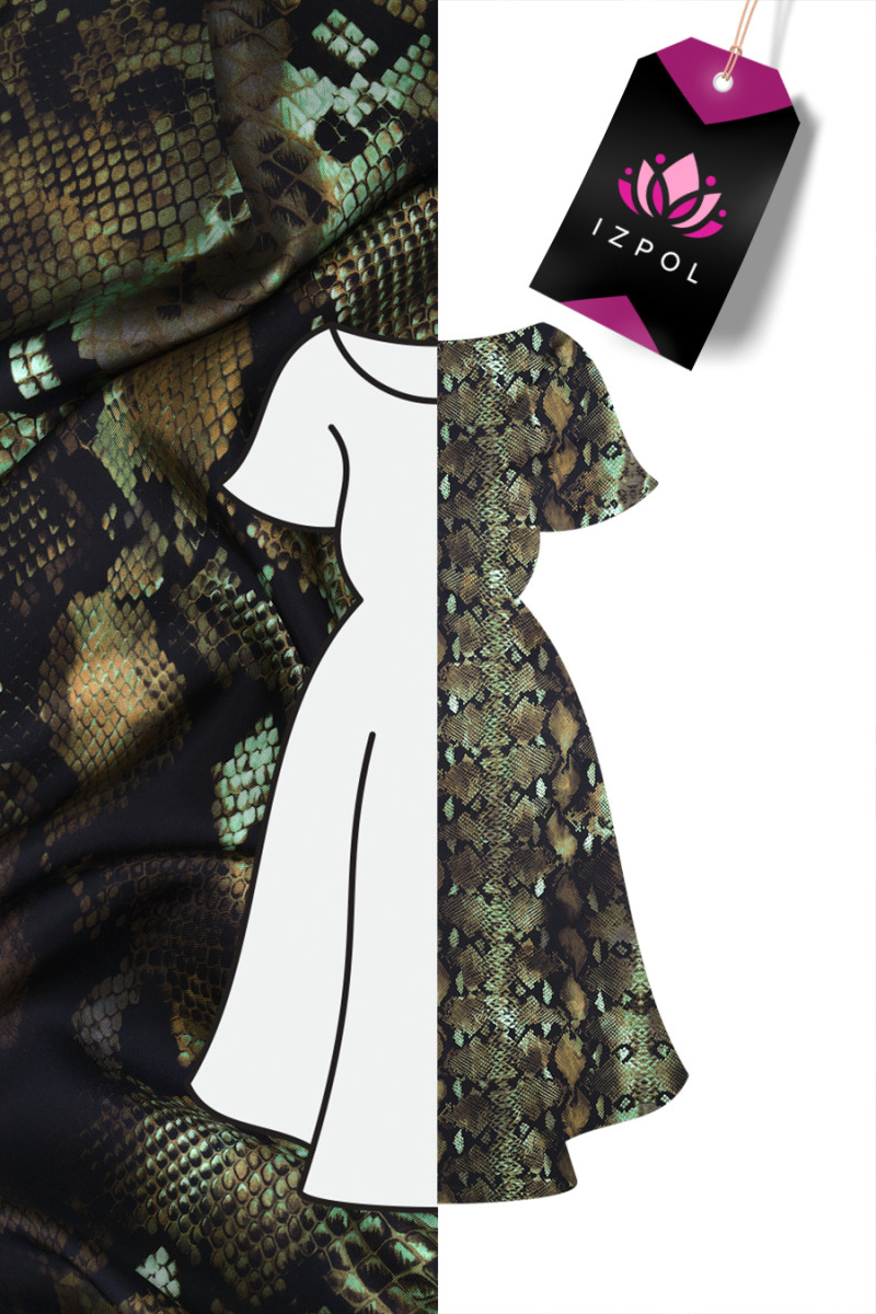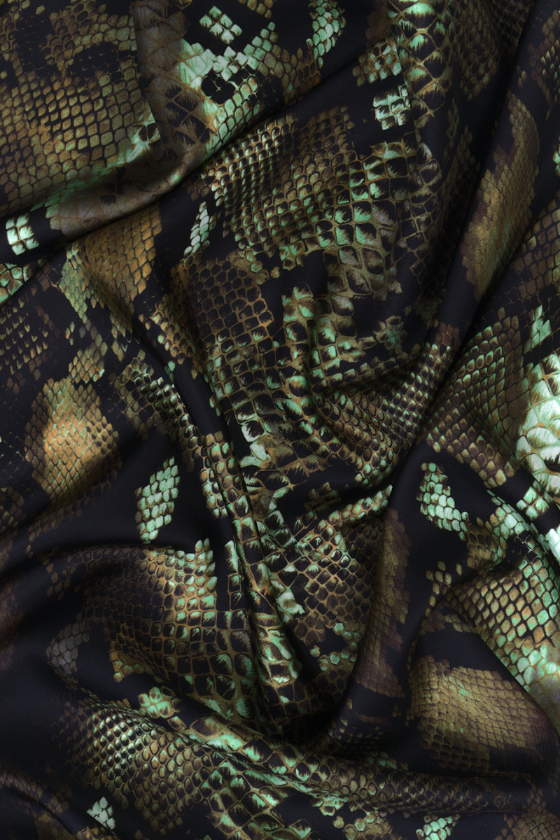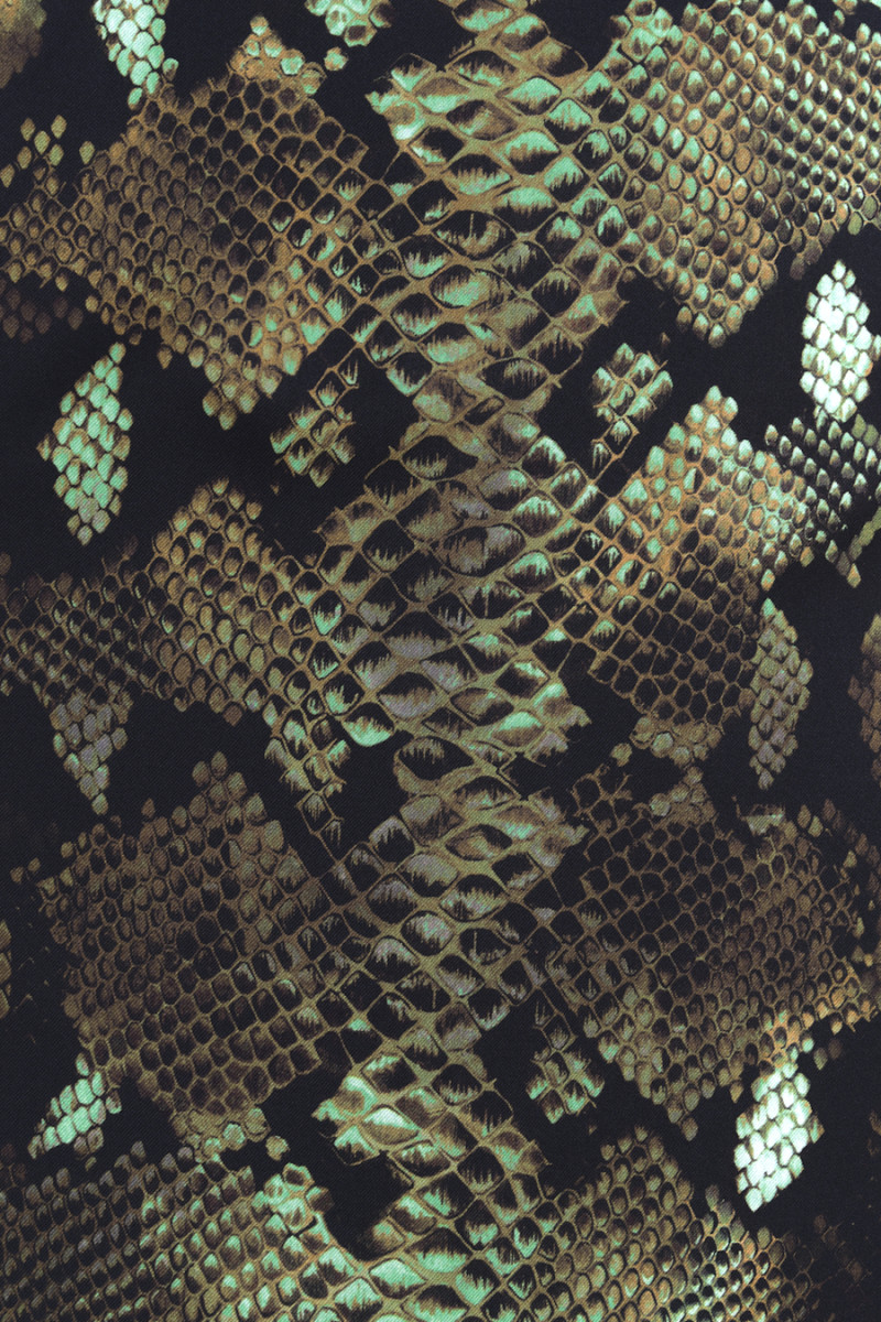 Italská 100% hedvábná keprová látka s motivem hadí kůže. Celek je udržován v béžové, hnědé, černé, olivové a zelené barvě. Látka je tenká, ale neprůhledná s jemnou keprovou vazbou, ideální pro šití košile, šatů nebo šátku. Fantastická nabídka pro fanoušky zvířecích vzorů v tlumených barvách.