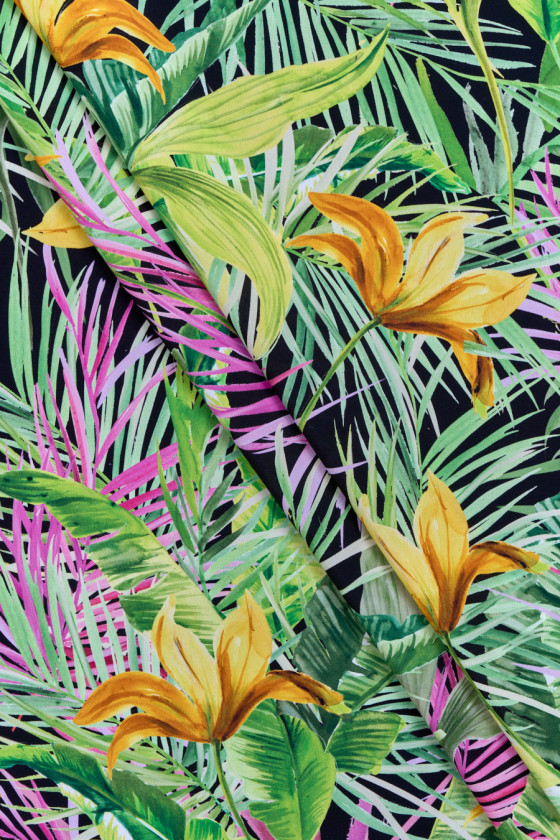 Italský 100% hedvábný krep s motivem tropické vegetace na černém podkladu. Velmi hustý vzor v energických zelených a žlutých barvách s růžovými akcenty. Látka je velmi lehká, vzdušná, neelastická, zakončená velmi jemným leskem. Jedinečná nabídka, která bude ideální pro šití halenky, košile, šatů nebo tuniky.