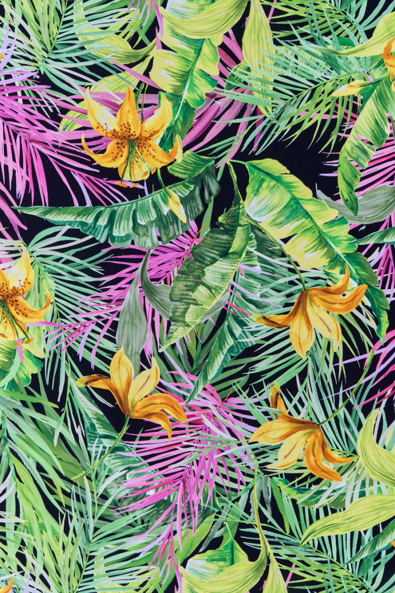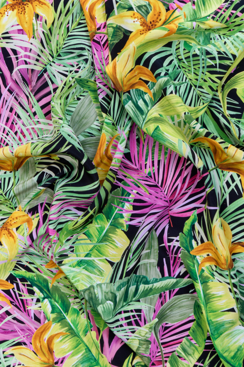 Italské krepové 100% hedvábí s motivem tropické vegetace na černém pozadí. Velmi hustý vzor v energické zelené a žluté barvě s růžovými akcenty. Látka je velmi lehká, vzdušná, neelastická, zakončená velmi jemným leskem. Jedinečný návrh, který se bude skvěle hodit pro ušití halenky, košile, šatů nebo tuniky.