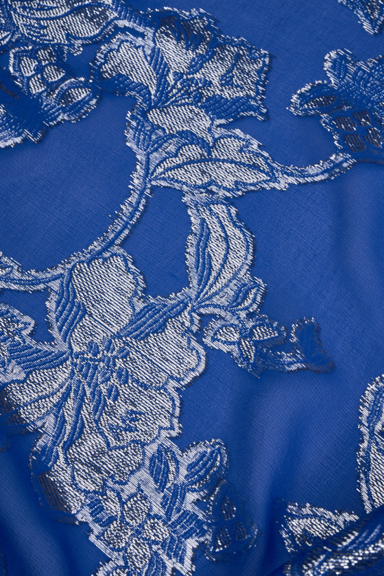 Italská chrpově modrá hedvábná látka s vyšívanými květy ze stříbrné, lesklé nitě. Tkanina s žoržetovou vazbou, tenká, průhledná, velmi lehká, neelastická. Krásná nabídka, ze které můžete vytvořit jedinečné, vzdušné šaty, stejně jako halenku, sukni nebo tuniku.