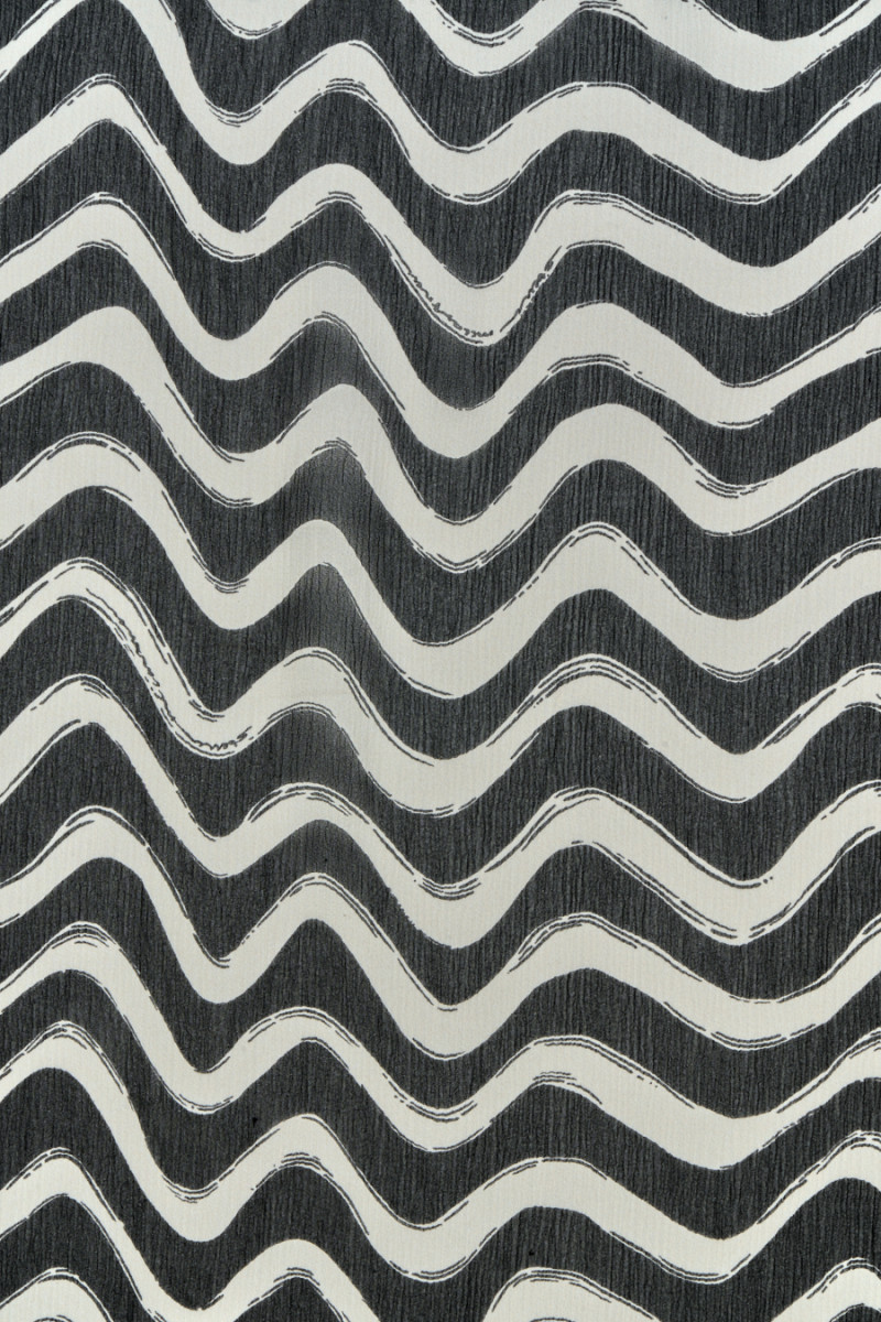 Italský šifon mačkaný 100% hedvábí s motivem bílých vln na černém pozadí. Hustý, opakující se vzor s rozestupy každé 2 cm. Látka je lehká, vzdušná, průhledná a pochází z kolekce známého módního návrháře. Zajímavý návrh na vytvoření šatů, halenky nebo sukně.