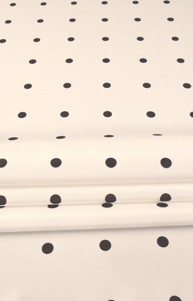 Hedvábný krep Polka Dot je jemná, tenká, ale poloprůhledná látka s mírným leskem. Lze s ním vykouzlit vzdušné šaty, jemné halenky, šátky, šátky. Doporučujeme zvolit podšívku.