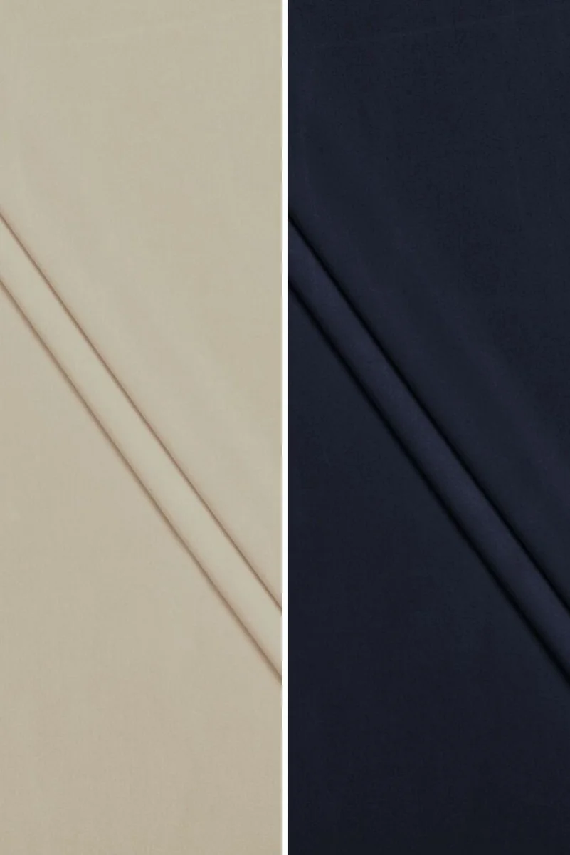 Italská viskózová pletenina ve dvou barvách: béžová a tmavě tmavě modrá. Pletenina s hladkou vazbou, elastická, splývavá, chladivá na dotek a neprůhledná. Skvěle se hodí k letnímu oblečení, a to díky příjemnému chladivému efektu při dotyku s pokožkou. Doporučujeme k šatům, sukním, halenkám. Pleteninu lze použít pro přiléhavé střihy i volnější, splývavé střihy.