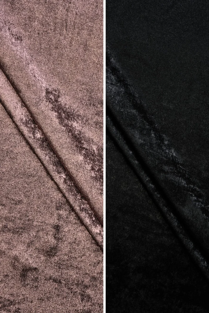Italská polyesterová tkanina ve dvou barevných provedeních - černá a růžová na černé levé straně. Látka je stínovaná, lehká, splývavá, tenká, ale docela dobře krycí. Krásně se leskne, což mu dodává výjimečnou eleganci a je měkký a příjemný na úchop. Bude fantastický k vzdušným šatům a sukním, stejně jako k zajímavým halenkám.