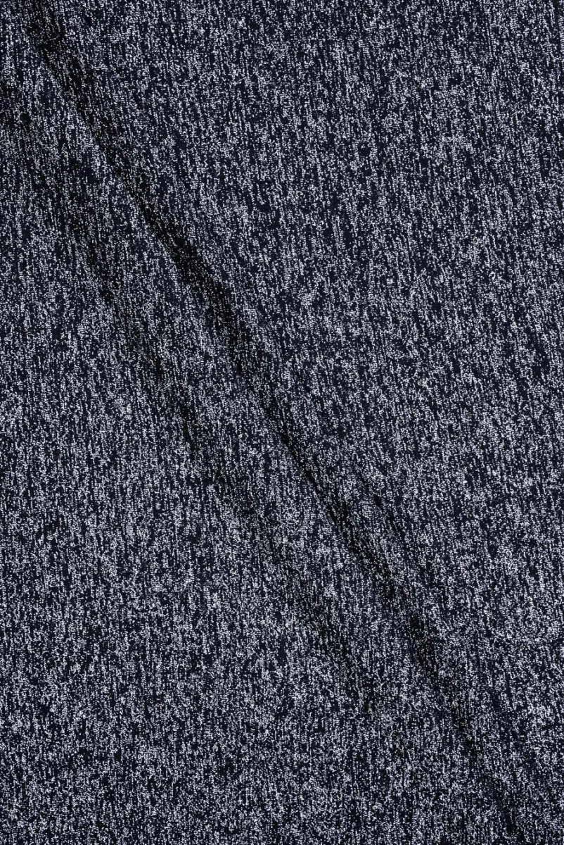 Italská viskózová pletená látka v černé barvě s hustě tkanou stříbrnou, lesklou nití. Pletená látka je velmi lehká, pružná, mírně průhledná a splývavá. Lesklá nit dodává materiálu formální vzhled. Je ideální na šití halenky, topu, šatů a sukně.