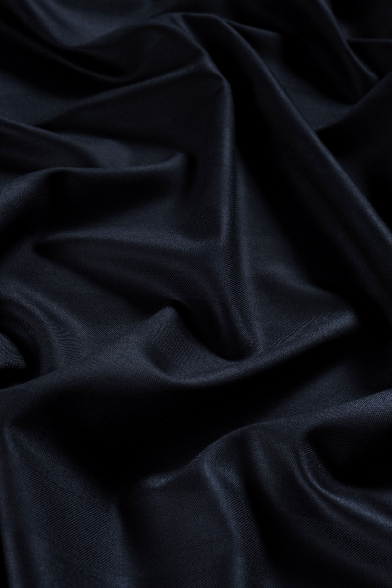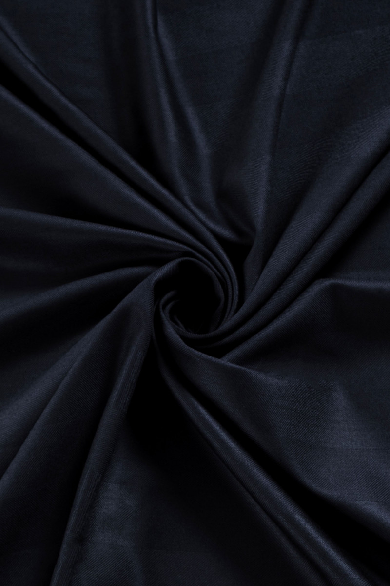 Italská kostýmová vlna ve velmi tmavé tmavě modré barvě. Krásný motiv rybí kosti tvořící svislé pruhy široké 3,5 cm. Neelastická, masitá tkanina s jemným, ušlechtilým leskem.