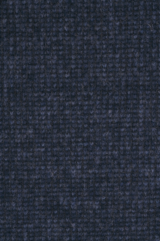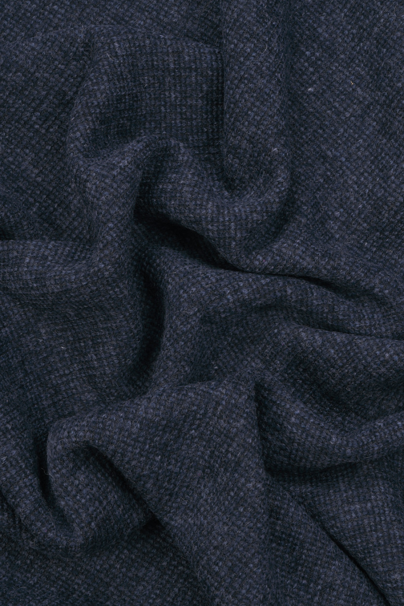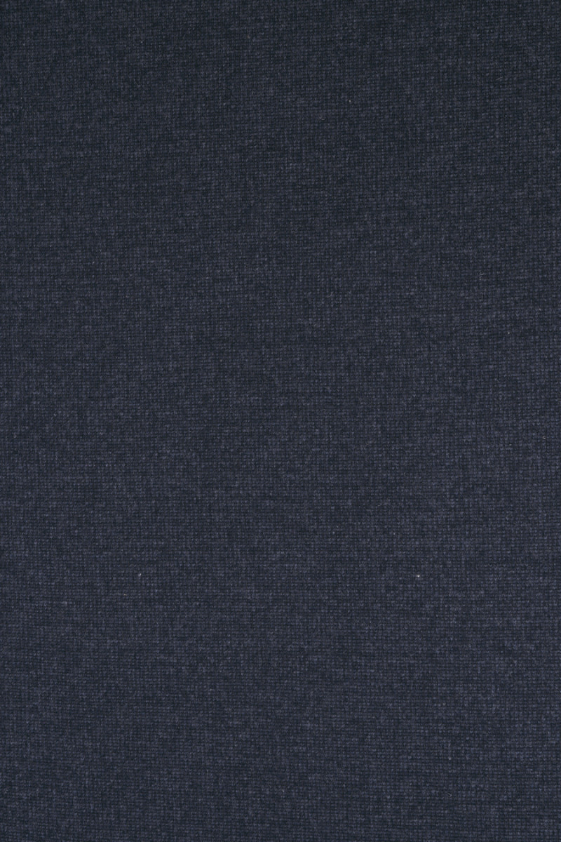 Italská, hustá vlna svetru v modré a tmavě modré melanži. "Dvojitá" tkanina s žebrovou vazbou na jedné straně (0,5 cm) a hladkou na druhé straně, připomínající napařenou vlnu.