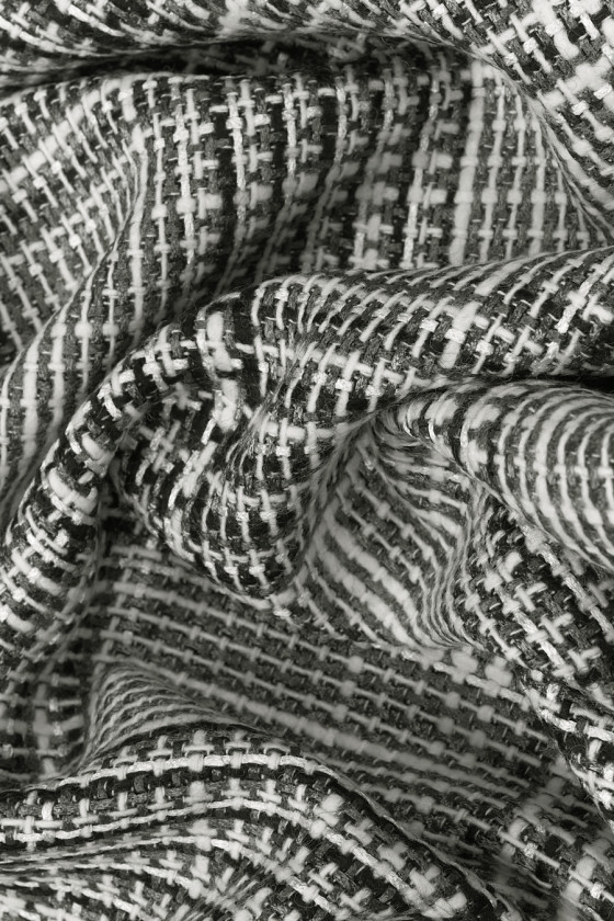 Italská, silnější bižbuť s velkým kostkovaným motivem (10 cm) v černé, šedé, stříbrné a écru barvě. Silnější, neelastická tkanina s vazbou připomínající látku chanel.