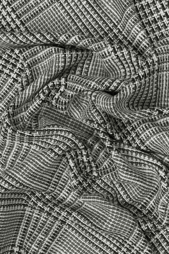 Italská, silnější bižbuť s velkým kostkovaným motivem (10 cm) v černé, šedé, stříbrné a écru barvě. Silnější, neelastická, tkaná tkanina - ideální pro šití kostýmu, tenčího saka nebo kabátu.