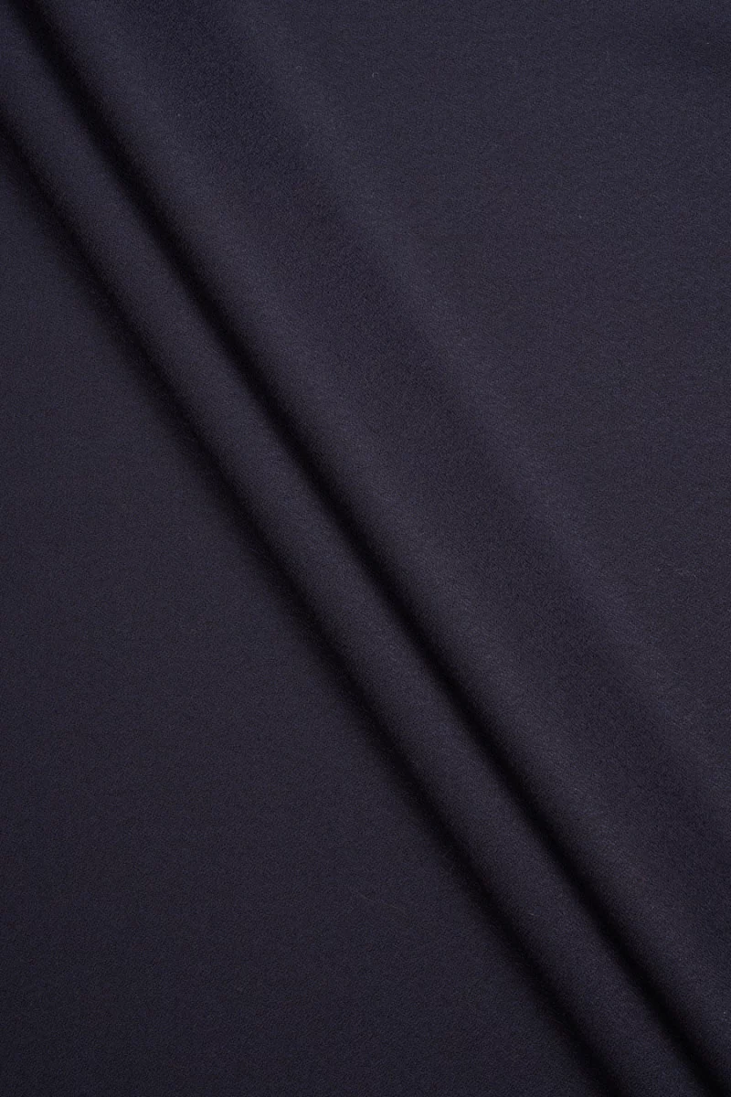 Italská 100% bižbujová vlna ve velmi tmavé tmavě modré barvě. Masitá, měkká, splývavá látka s jemnou texturou, ale hladká na dotek, zakončená jemným leskem. Klasický návrh z látek z kolekcí podzim-zima, určený na sako, kalhoty, šaty nebo sukni.