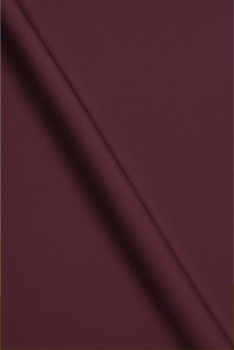 Italská kostýmní látka vyrobená ze 100% přírodní vlny v tmavě vínové barvě. Látka je silnější – dvojitá s konstrukční vazbou, neelastická, pevně položená. Je ideální na šití podzimního a zimního oblečení, jako jsou: šaty, sukně, bundy nebo tenký kabát a bunda. Skvělá volba pro lidi, kteří si cení kvalitních látek.