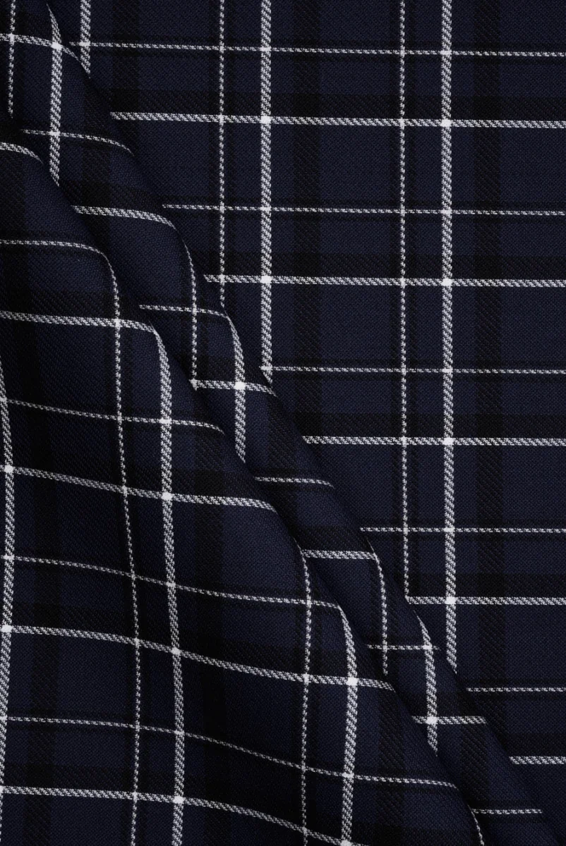 Italská oboustranná vlna v námořnické modři s černobílým kostkovaným motivem. Kostkovaný je poměrně velký, jeden motiv má asi 6 cm*6,5 cm. Látka je masitá, poměrně silná, neelastická, vyrobená z hrubosměrné vazby a dvouvrstvá – levá strana je bez tmavě tmavě modrého vzoru. Materiál je velmi kvalitní. Doporučujeme ho především na bundy, vesty, šaty a sukně.