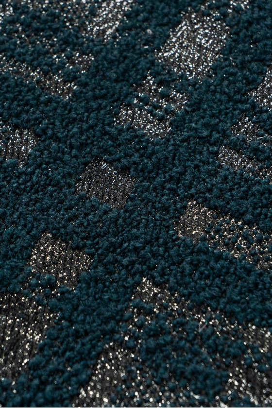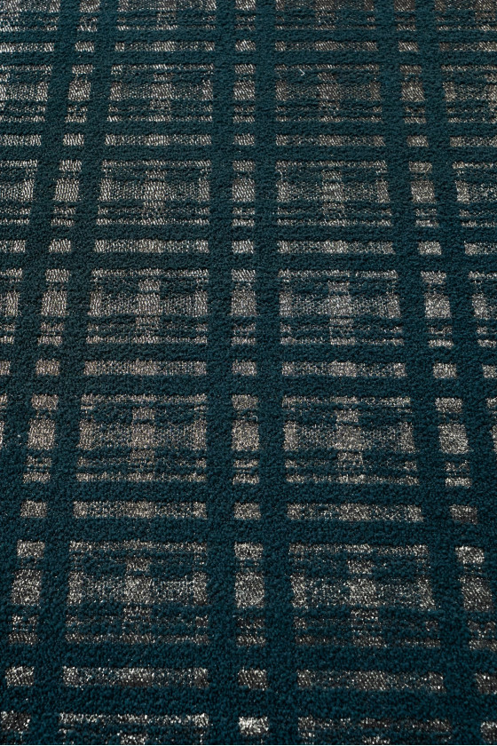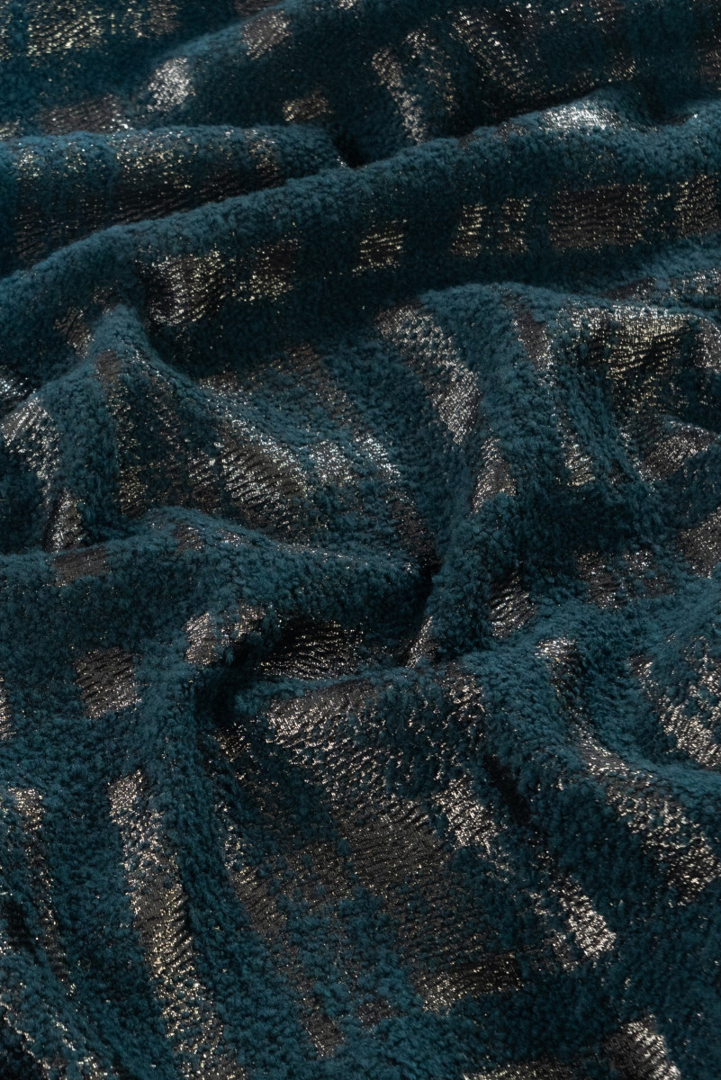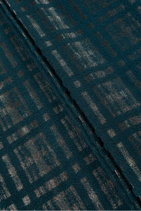 Italská kostýmová tkanina s bucle vazbou v mořské zelené barvě se stříbrným károvaným motivem. Tkanina tkaná z přírodní vlny s přídavkem lurexové nitě, velmi efektní.