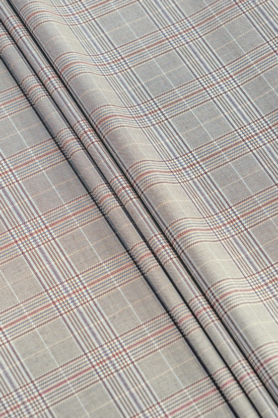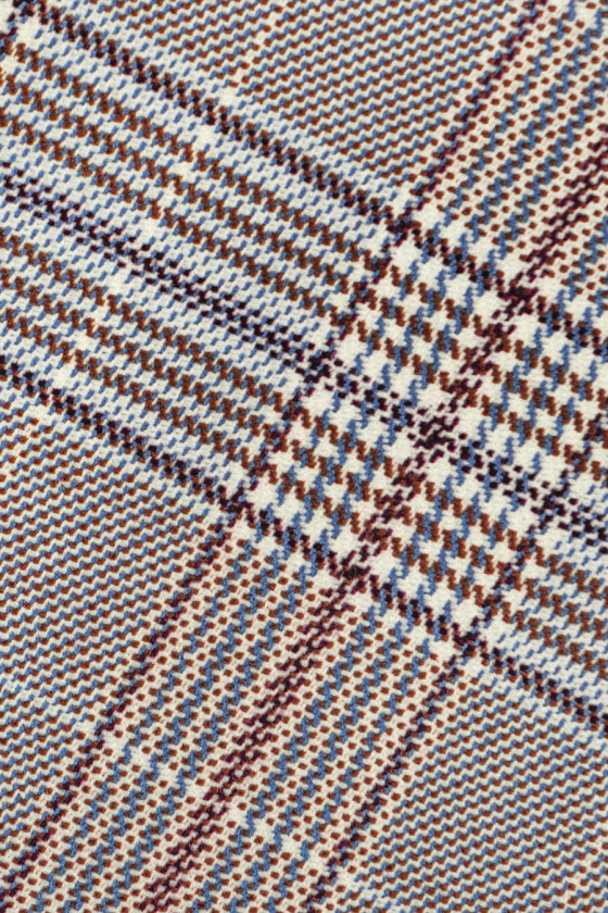 Italská kostýmová látka ecru s károvaným motivem v tmavě béžové, modré a hnědé barvě. Krásná, klasická barevná kombinace pro lidi, kteří mají rádi nadčasové oblečení. Mírně elastická tkanina s kompaktní vazbou a hladkým povrchem. Fantastická nabídka pro ušití saka, obleku, klasických šatů nebo sukně.