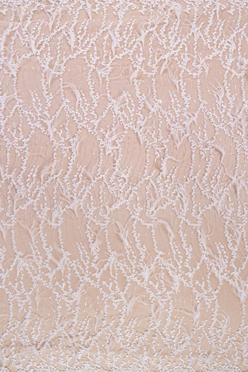 Italská krajka na krémově zbarveném tylu. Krásný motiv malých květin, jemně zdobených peřím, perlami a průhlednými flitry. Korunka je dokončena zubem na obou stranách, šijeme ji po obvodu (kvůli peříčku ji nelze otočit). Perfektní na šití svatebních a večerních šatů.