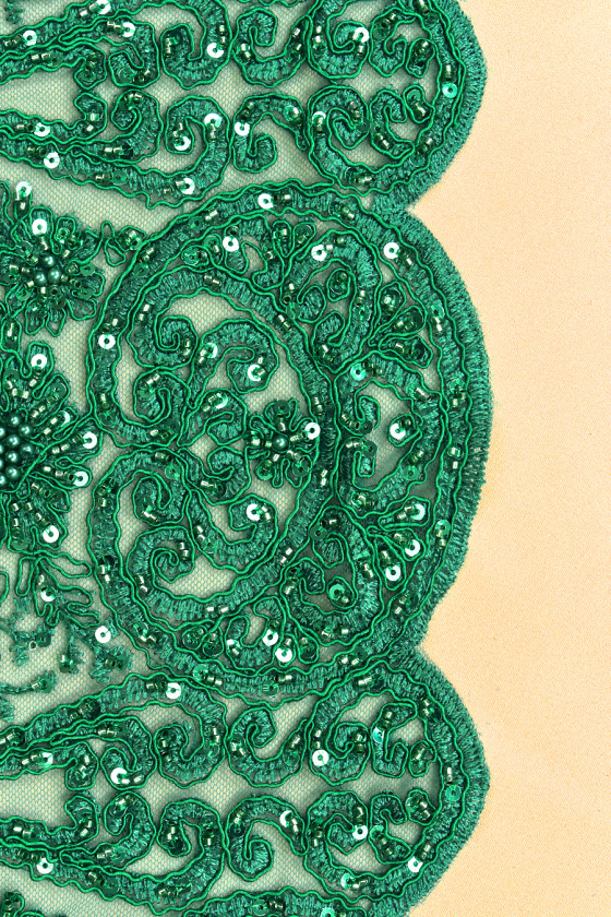 Italská krajková večerní látka v zelené barvě, vyrobená z tylu ve stejné barvě s rovnoměrně vyšívanými květinovými motivy o velikosti 10 cm*20 cm. Je bohatě zdobena zelenými flitry, korálky a perlami a zdobena zelenou šňůrkou, díky níž je vzor mírně konvexní. Okraje látky jsou zakončeny širokým, ozdobným zubem - šijeme po obvodu.
